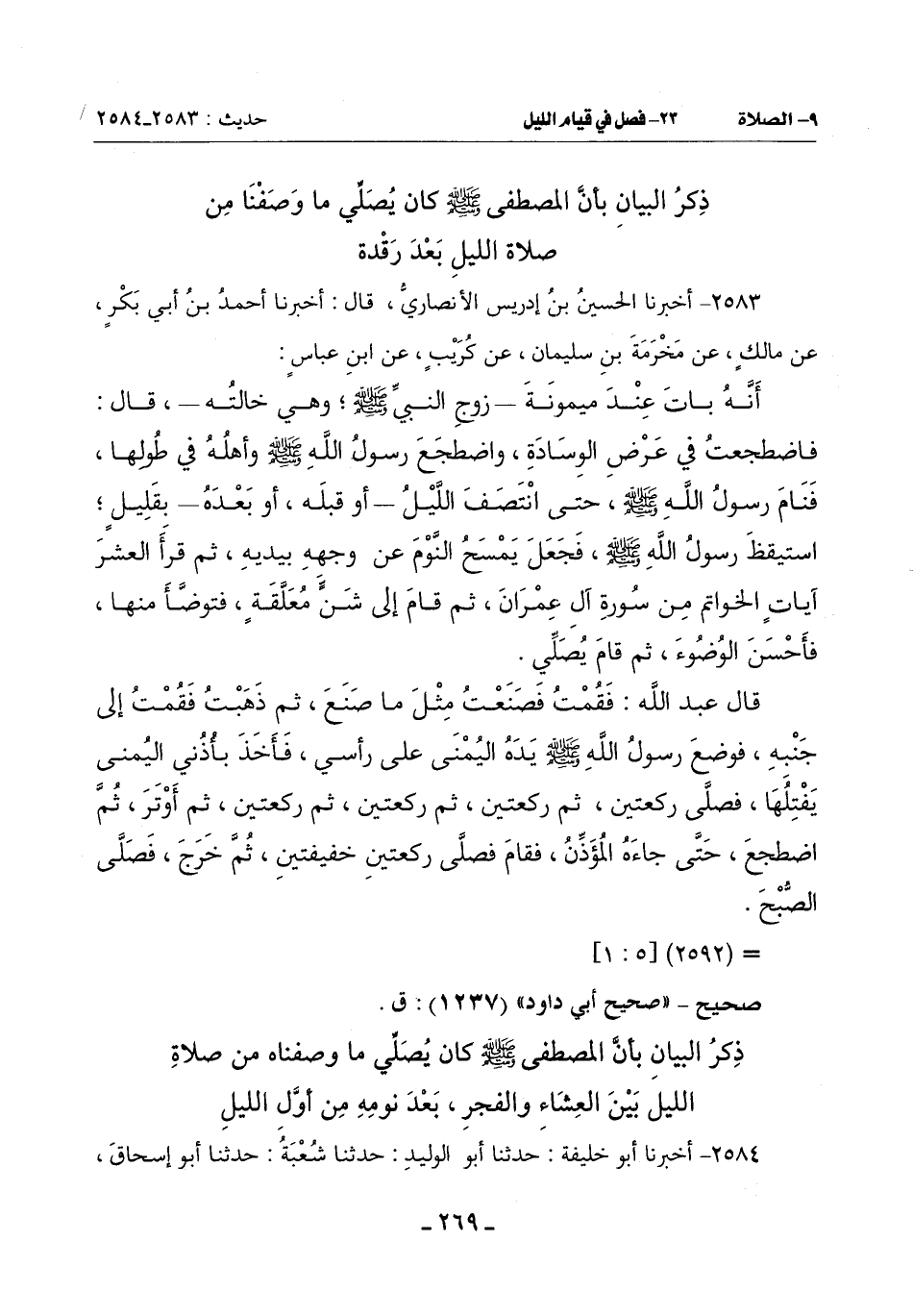 ذِكْرُ الْبَيَانِ بِأَنَّ الْمُصْطَفَى صَلَّى اللَّهُ عَلَيْهِ وَسَلَّمَ كَانَ يُصَلِّي مَا وَصَفْنَاهُ مِنْ صَلَاةِ اللَّيْلِ بَيْنَ الْعِشَاءِ وَالْفَجْرِ بَعْدَ نَوْمِهِ مِنْ أول الليل