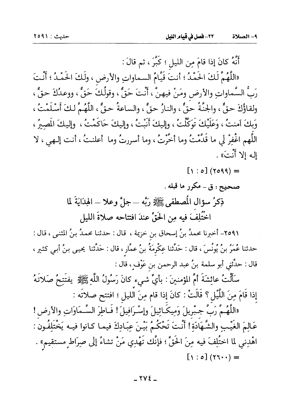 (اللَّهُمَّ رَبَّ جِبْرِيلَ وَمِيكَائِيلَ وَإِسْرَافِيلَ فَاطِرَ السَّمَاوَاتِ وَالْأَرْضِ عَالِمَ الْغَيْبِ وَالشَّهَادَةِ أَنْتَ تَحْكُمُ بَيْنَ عِبَادِكَ فِيمَا كَانُوا فِيهِ يَخْتَلِفُونَ اهْدِنِي لَمَا اختُلِفَ فِيهِ مِنَ الْحَقِّ فَإِنَّكَ تَهْدِي من تشاء إلى صراط مستقيم)
