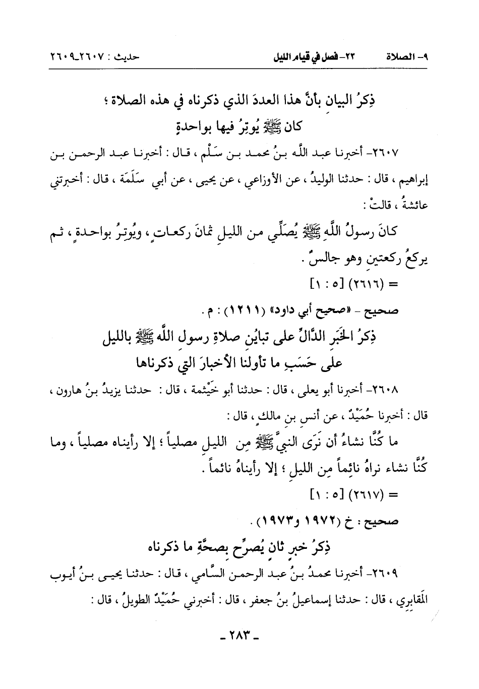 ذِكْرُ الْبَيَانِ بِأَنَّ هَذَا الْعَدَدَ الَّذِي ذَكَرْنَاهُ فِي هَذِهِ الصَّلَاةِ كَانَ صَلَّى اللَّهُ عَلَيْهِ وَسَلَّمَ يُوتِرُ فِيهَا بِوَاحِدَةٍ