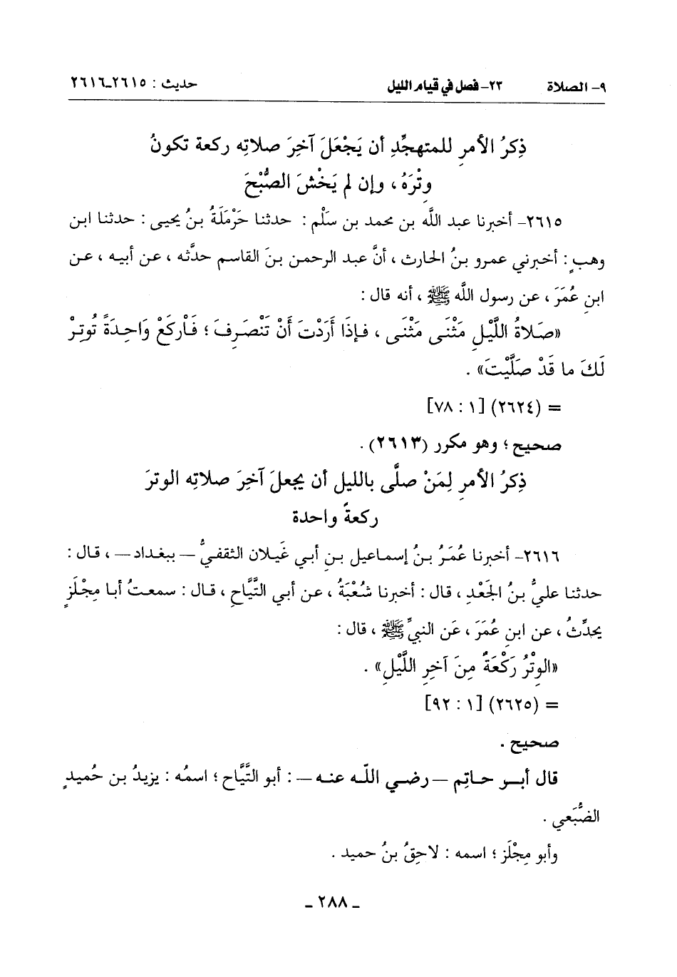 (صَلَاةُ اللَّيْلِ مَثْنَى مَثْنَى فَإِذَا أَرَدْتَ أَنْ تَنْصَرِفَ فَارْكَعْ وَاحِدَةً تُوتِرُ لك ما قد صليت)
