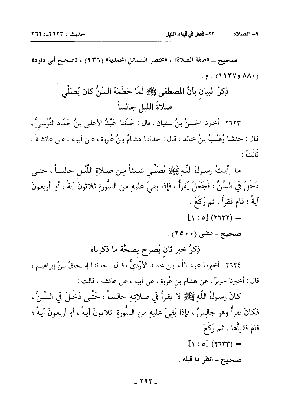 ذِكْرُ الْبَيَانِ بِأَنَّ الْمُصْطَفَى صَلَّى اللَّهُ عَلَيْهِ وَسَلَّمَ لَمَّا حَطَمَهُ السِّنُّ كَانَ يُصَلِّي صَلَاةَ الليل جالسا