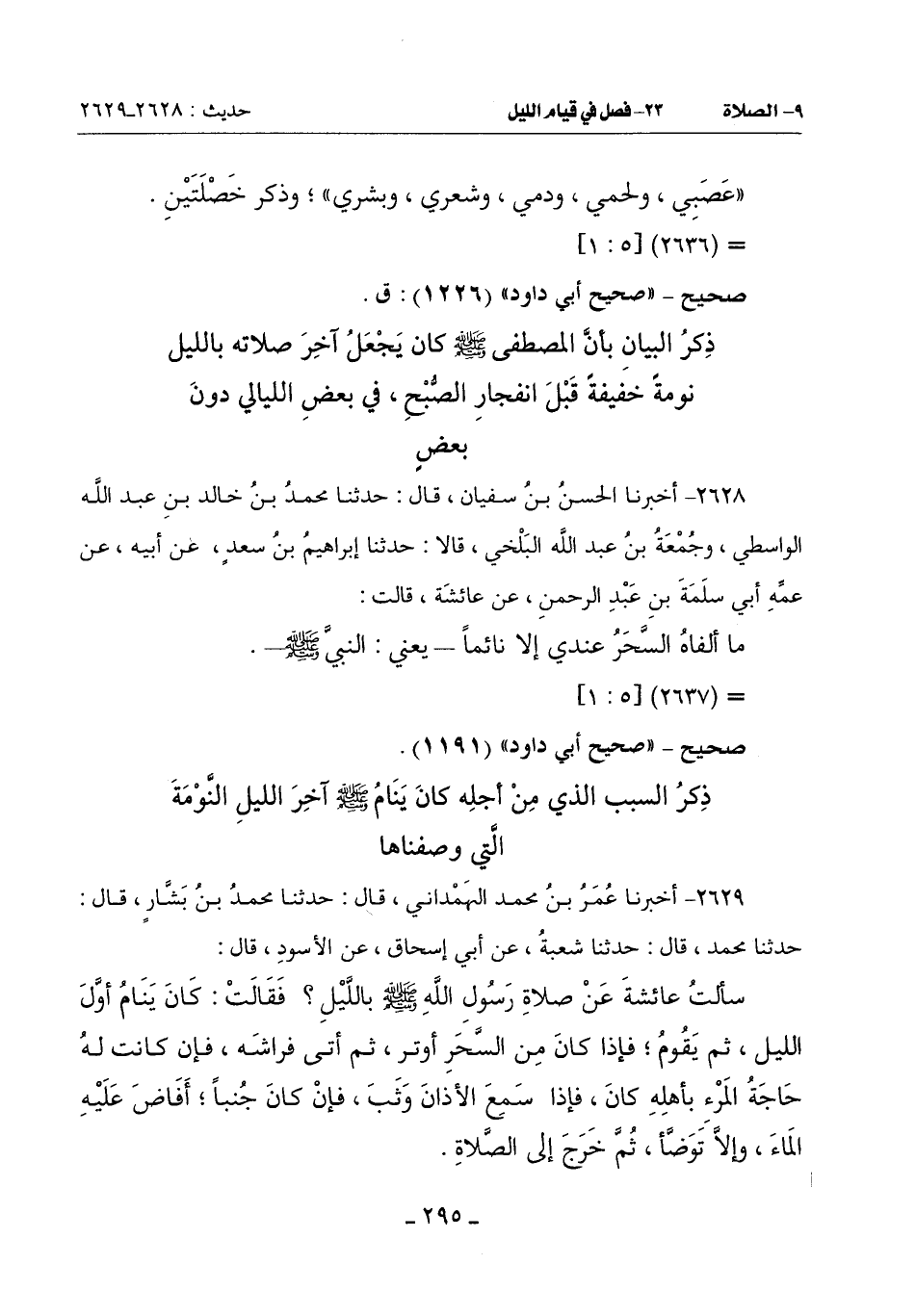 : سَأَلْتُ عَائِشَةَ عَنْ صَلَاةِ رَسُولِ اللَّهِ صَلَّى اللَّهُ عَلَيْهِ وَسَلَّمَ بِاللَّيْلِ فَقَالَتْ: كَانَ يَنَامُ أَوَّلَ اللَّيْلِ ثُمَّ يَقُومُ فَإِذَا كَانَ مِنَ السَّحَرِ أَوْتَرَ ثُمَّ أَتَى فِرَاشَهُ فَإِنْ كَانَتْ لَهُ حَاجَةُ الْمَرْءِ بِأَهْلِهِ كَانَ فَإِذَا سَمِعَ الْأَذَانَ وَثَبَ فَإِنْ كَانَ جُنُبًا أَفَاضَ عَلَيْهِ الْمَاءَ وَإِلَّا تَوَضَّأَ ثُمَّ خَرَجَ إِلَى الصلاة -[296]-