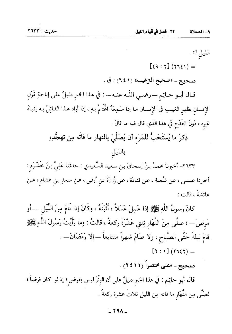 قَالَ أَبُو حَاتِمٍ: فِي هَذَا الْخَبَرِ دَلِيلٌ عَلَى أَنَّ الْوِتْرَ لَيْسَ بِفَرْضٍ إِذْ لَوْ كَانَ فَرْضًا لَصَلَّى مِنَ النَّهَارِ مَا فَاتَهُ مِنَ اللَّيْلِ ثَلَاثَ عَشْرَةَ رَكْعَةً