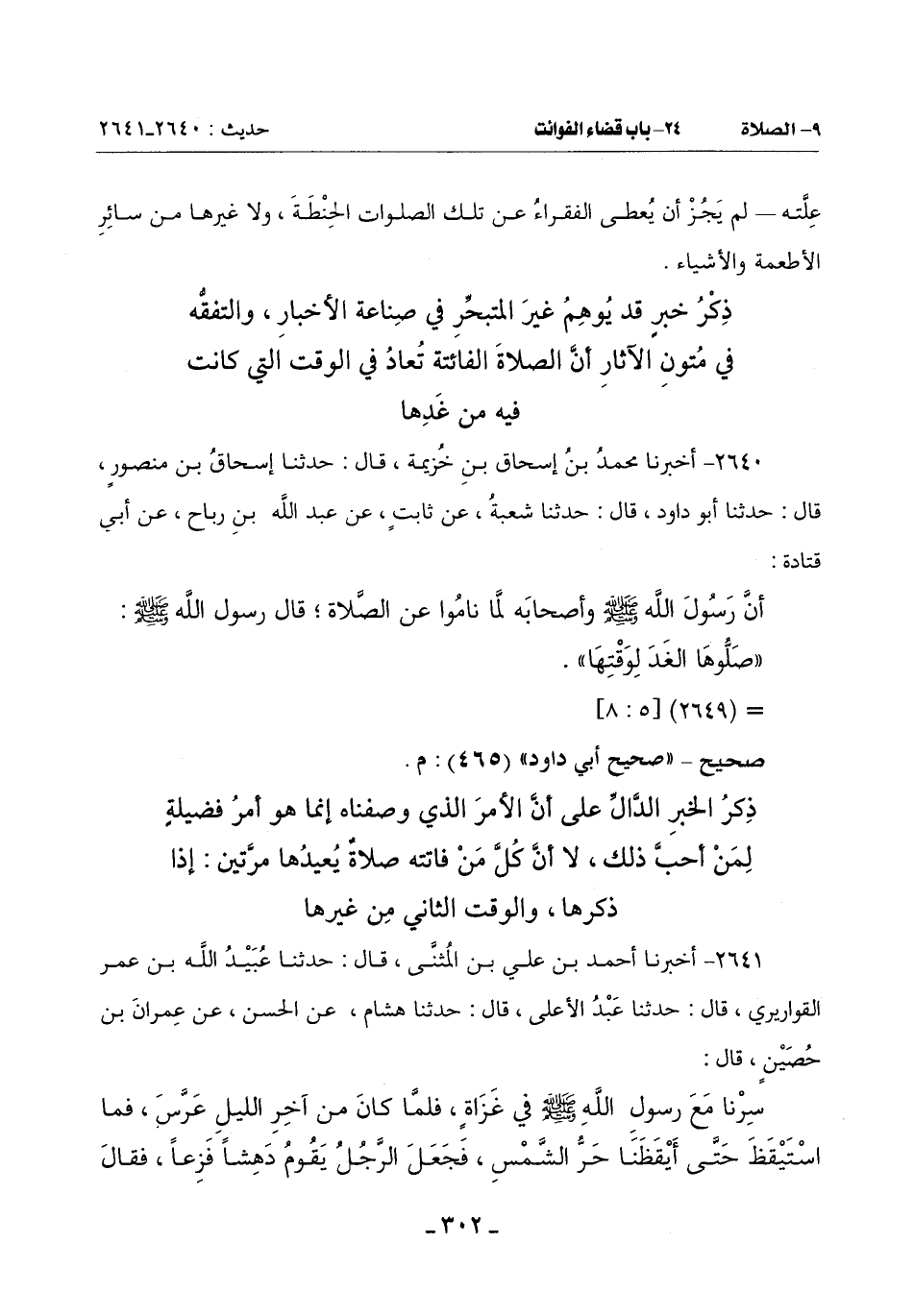2640 - أَخْبَرَنَا مُحَمَّدُ بْنُ إِسْحَاقَ بْنِ خُزَيْمَةَ قَالَ: حدثنا إسحاق ابن مَنْصُورٍ قَالَ: حَدَّثَنَا أَبُو دَاوُدَ قَالَ: حَدَّثَنَا شُعْبَةُ عَنْ ثَابِتٍ عَنْ عَبْدِ اللَّهِ بْنِ رَبَاحٍ عَنْ أَبِي قَتَادَةَ: