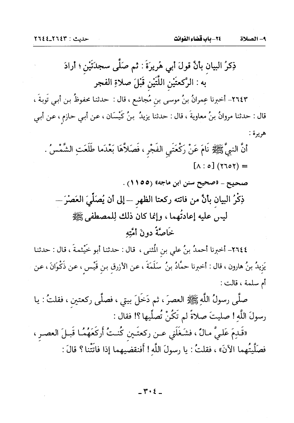 (قَدِمَ عَليَّ مالٌ فَشَغَلَنِي عَنْ رَكْعَتَيْنِ كُنْتُ أَرْكَعُهُمَا قَبْلَ الْعَصْرِ فَصَلَّيْتُهُمَا الْآنَ) فَقُلْتُ: يَا رَسُولَ اللَّهِ أَفَنَقْضِيهِمَا إذا فاتتنا؟ قال: -[305]-