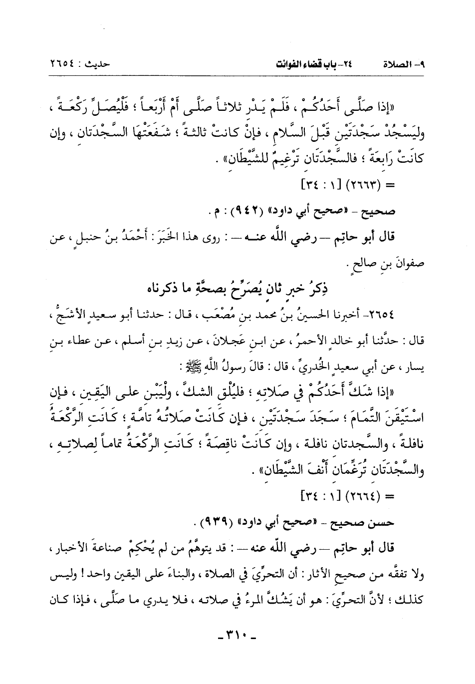 قَالَ أَبُو حَاتِمٍ ـ رَضِيَ اللَّهُ عَنْهُ ـ: قَدْ يَتَوَهَّمُ مَنْ لَمْ يُحْكِمْ صِنَاعَةَ الْأَخْبَارِ وَلَا تَفَقَّهَ مِنْ صَحِيحِ الْآثَارِ أَنَّ التَّحَرِّيَ فِي الصَّلَاةِ وَالْبِنَاءَ عَلَى الْيَقِينِ وَاحِدٌ وَلَيْسَ كَذَلِكَ لِأَنَّ التَّحَرِّيَ هُوَ أَنْ يَشُكَّ الْمَرْءُ فِي صَلَاتِهِ فَلَا يَدْرِي مَا صَلَّى فَإِذَا كَانَ -[311]- كَذَلِكَ عَلَيْهِ أَنْ يَتَحَرَّى الصَّوَابَ وَلْيَبْنِ عَلَى الْأَغْلَبِ عِنْدَهُ وَيَسْجُدْ سَجْدَتَيِ السَّهْوِ بَعْدَ السَّلَامِ عَلَى خَبَرِ ابْنِ مَسْعُودٍ