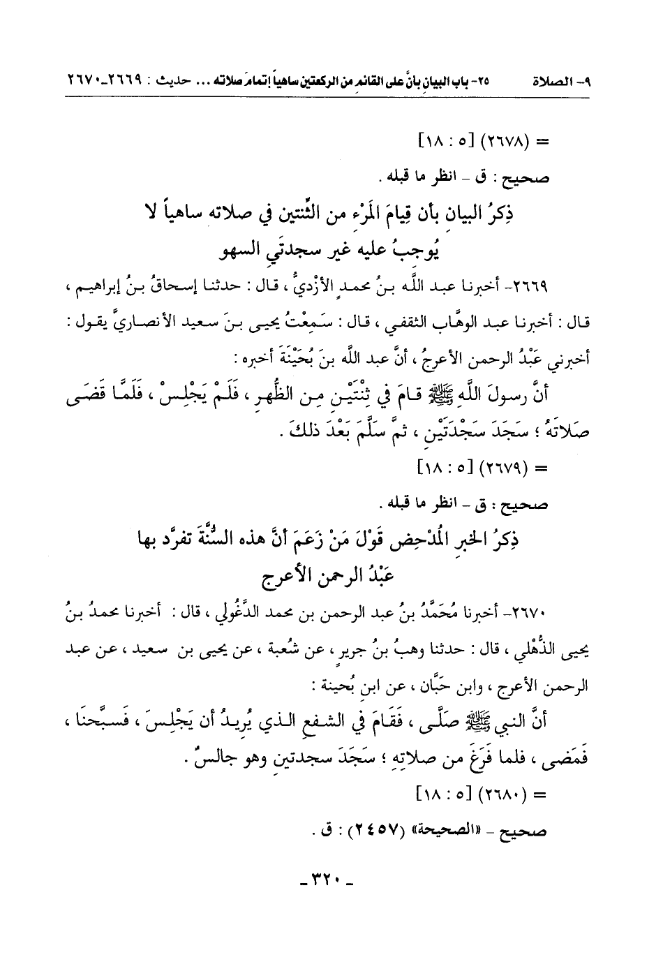 2670 - أَخْبَرَنَا مُحَمَّدُ بْنُ عَبْدِ الرَّحْمَنِ بْنِ مُحَمَّدٍ الدَّغَوْلِيُّ قَالَ: أَخْبَرَنَا مُحَمَّدُ بْنُ يَحْيَى الذُّهْلِيُّ قَالَ: حَدَّثَنَا وَهْبُ بْنُ جَرِيرٍ عَنْ شُعْبَةَ عَنْ يَحْيَى بْنِ سَعِيدٍ عَنْ عَبْدِ الرَّحْمَنِ الْأَعْرَجِ وَابْنِ حِبَّانَ عَنِ ابْنِ بُحَيْنَةَ: