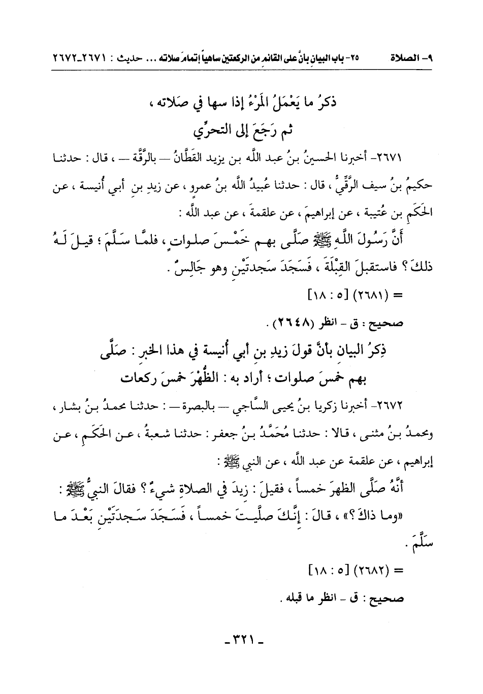 أَنَّهُ صَلَّى الظُّهْرَ خَمْسًا فَقِيلَ: زِيدَ فِي الصَّلَاةِ شَيْءٌ؟ فَقَالَ النَّبِيُّ صَلَّى اللَّهُ عَلَيْهِ وَسَلَّمَ: