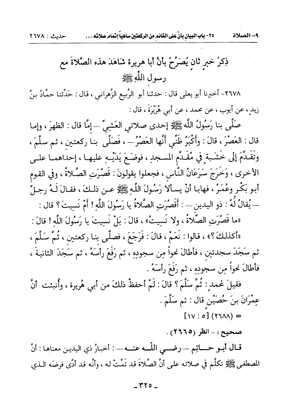 قَالَ أَبُو حَاتِمٍ ـ رَضِيَ اللَّهُ عَنْهُ ـ: أَخْبَارُ ذِي الْيَدَيْنِ مَعْنَاهَا: أَنَّ الْمُصْطَفَى صَلَّى اللَّهُ عَلَيْهِ وَسَلَّمَ تَكَلَّمَ فِي صَلَاتِهِ عَلَى أَنَّ الصَّلَاةَ قَدْ تمَّت لَهُ وَأَنَّهُ قَدْ أَدَّى فَرْضَهُ الَّذِي -[326]- عَلَيْهِ وَذُو الْيَدَيْنِ قَدْ تَوَهَّمَ أَنَّ الصَّلَاةَ قَدْ رُدَّتْ إِلَى الْفَرِيضَةِ الْأُولَى فَتَكَلَّمَ عَلَى أَنَّهُ فِي غَيْرِ الصَّلَاةِ وَأَنَّ صَلَاتَهُ قَدْ تَمَّتْ فَلَمَّا اسْتَثْبَتَ صَلَّى اللَّهُ عَلَيْهِ وَسَلَّمَ أَصْحَابَهُ كَانَ مِنَ اسْتِثْبَاتِهِ عَلَى يَقِينٍ أَنَّهُ قَدْ أَتَمَّ صَلَاتَهُ