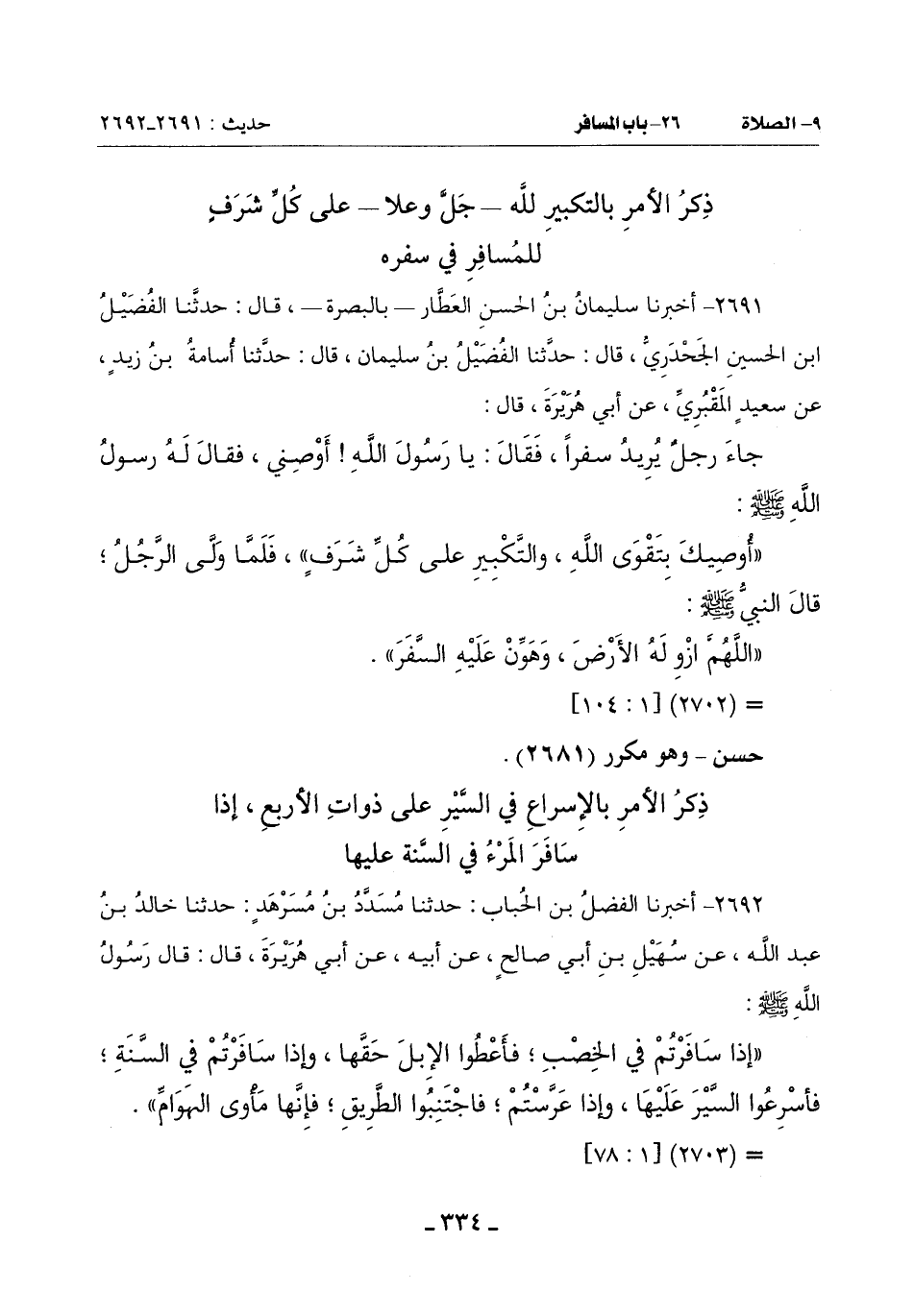 ذِكْرُ الْأَمْرِ بِالْإِسْرَاعِ فِي السَّيْرِ عَلَى ذَوَاتِ الْأَرْبَعِ إِذَا سَافَرَ الْمَرْءُ فِي السَّنة عَلَيْهَا