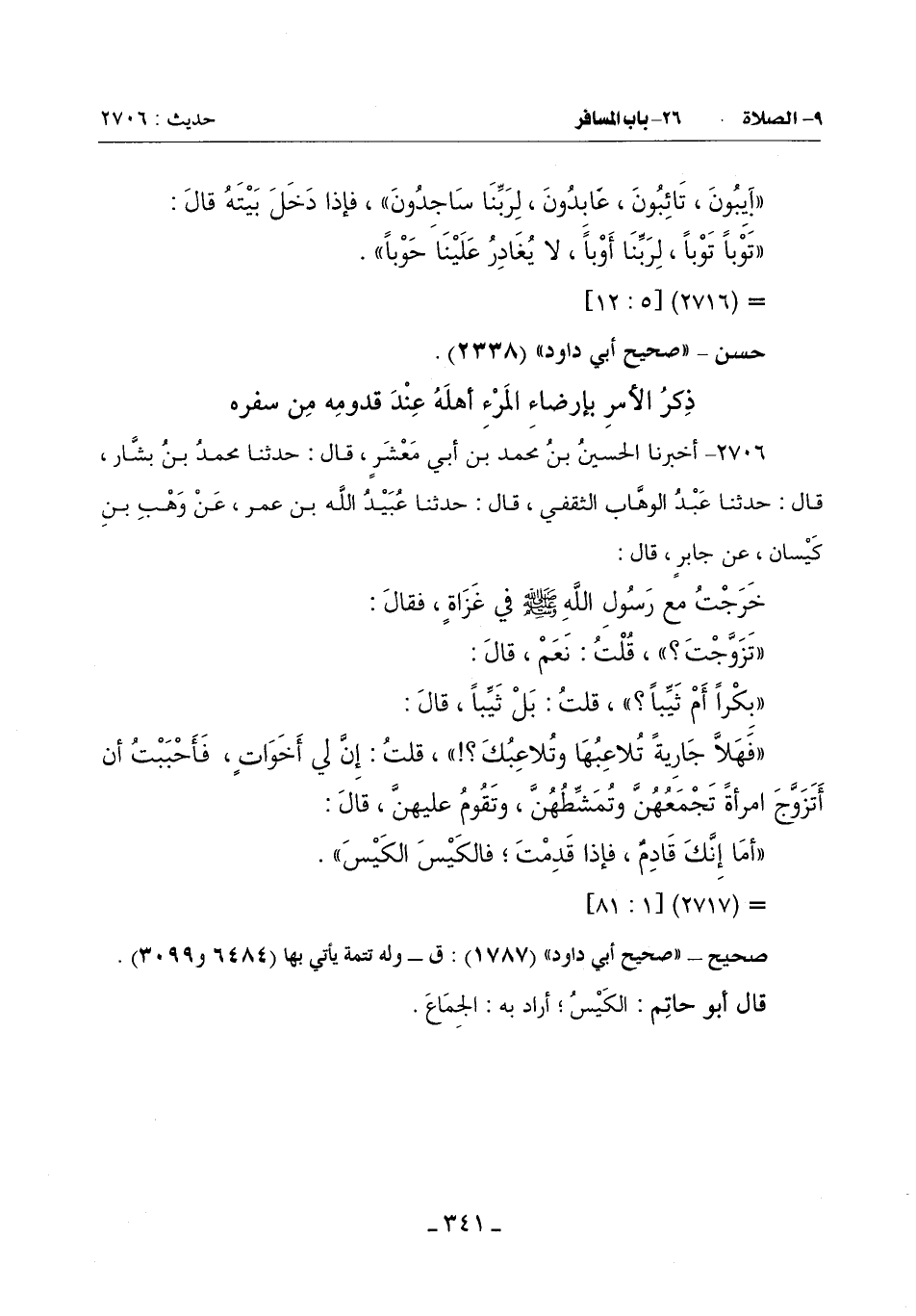 (فَهَلَّا جَارِيَةً تُلَاعِبُهَا وَتُلَاعِبُكَ؟ ) قُلْتُ: إِنَّ لِي أَخَوَاتٍ فَأَحْبَبْتُ أَنْ أَتَزَوَّجَ امْرَأَةً تَجْمَعُهُنَّ وتُمَشِّطُهُنَّ وَتَقُومُ عَلَيْهِنَّ قَالَ: