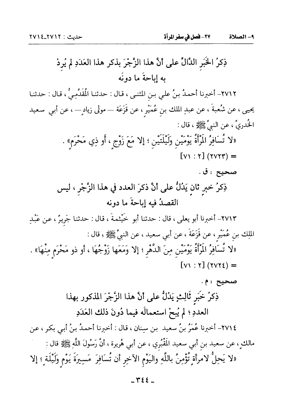 (لَا يَحِلُّ لِامْرَأَةٍ تُؤْمِنُ بِاللَّهِ وَالْيَوْمِ الْآخِرِ أَنْ تُسَافِرَ مَسِيرَةَ يَوْمٍ وليلة إلا -[345]- مع ذي محرم منها)