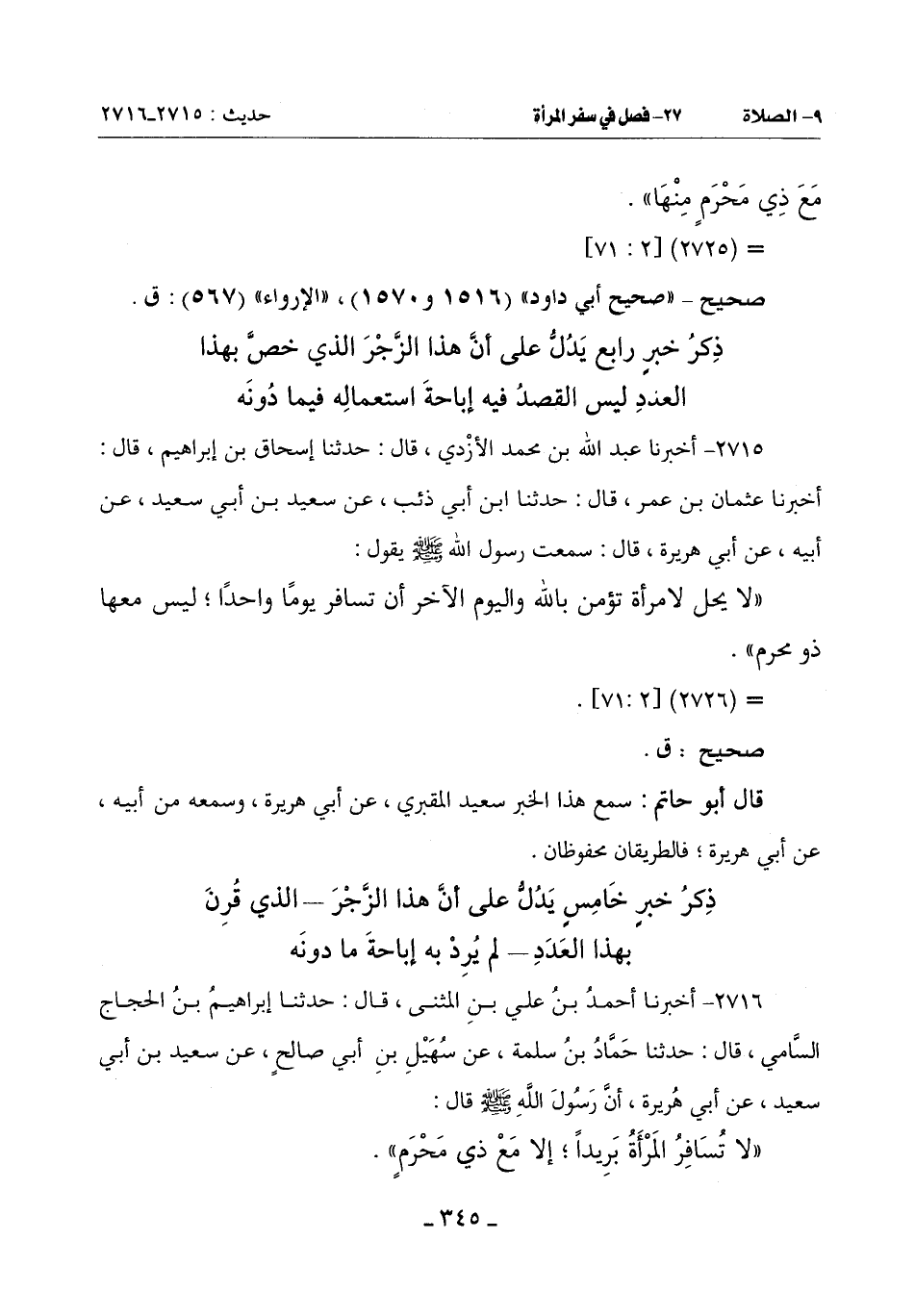 (لَا تُسَافِرِ الْمَرْأَةُ بَرِيداً إلا مع ذي محرم) -[346]-