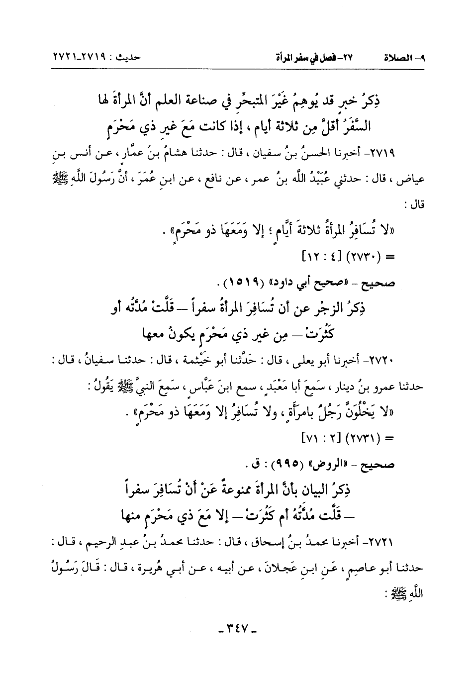 ذِكْرُ الْبَيَانِ بِأَنَّ الْمَرْأَةَ مَمْنُوعَةٌ عَنْ أَنْ تُسَافِرَ سَفَرًا ـ قَلَّتْ مُدَّتُهُ أَمْ كَثُرَتْ ـ إِلَّا مَعَ ذِي مَحْرَمٍ مِنْهَا