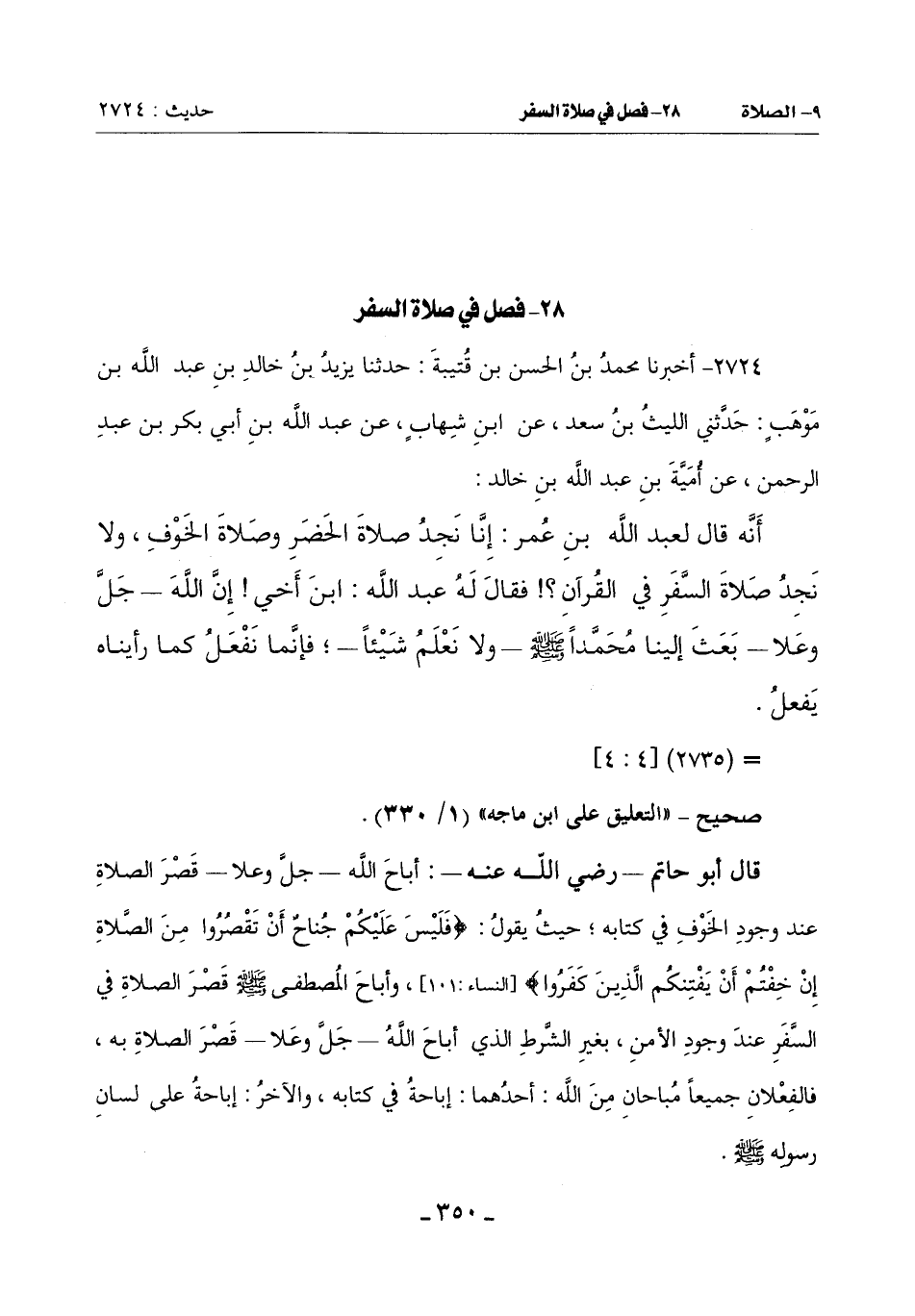 قَالَ أَبُو حَاتِمٍ ـ رَضِيَ اللَّهُ عَنْهُ ـ: أَبَاحَ اللَّهُ جَلَّ وَعَلَا قَصْرَ الصَّلَاةِ عِنْدَ وُجُودِ الْخَوْفِ فِي كِتَابِهِ حَيْثُ يَقُولُ: {فَلَيْسَ عَلَيْكُمْ جُنَاحٌ أَنْ تَقْصُرُوا مِنَ الصَّلَاةِ إِنْ خِفْتُمْ أن يفتنكم الذين كفروا} [النشاء: 101] وَأَبَاحَ الْمُصْطَفَى صَلَّى اللَّهُ عَلَيْهِ وَسَلَّمَ قَصْرَ الصَّلَاةِ فِي السَّفَرِ عِنْدَ وُجُودِ الْأَمْنِ بِغَيْرِ الشَّرْطِ الَّذِي أَبَاحَ اللَّهُ جَلَّ وَعَلَا قَصْرَ الصَّلَاةِ بِهِ فَالْفِعْلَانِ جَمِيعًا مُبَاحَانِ مِنَ اللَّهِ أَحَدُهُمَا إِبَاحَةٌ فِي كِتَابِهِ وَالْآخَرُ إِبَاحَةٌ عَلَى لِسَانِ رَسُولِهِ صَلَّى اللَّهُ عَلَيْهِ وَسَلَّمَ