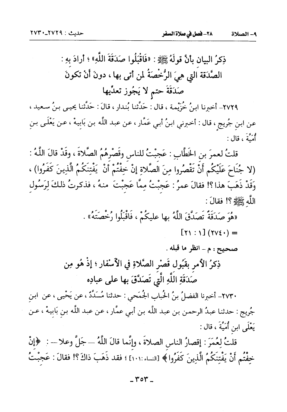 قُلْتُ لِعُمَرَ بْنِ الْخَطَّابِ: عجبتُ لِلنَّاسِ وقَصْرِهُم الصلاة وقد قال الله: {لا جناح عليكم أَنْ تَقْصُرُوا مِنَ الصَّلَاةِ إِنْ خِفْتُمْ أَنْ يَفْتِنَكُمُ الَّذِينَ كَفَرُوا} وَقَدْ ذَهَبَ هَذَا فَقَالَ عُمَرُ: عجبتُ مِمَّا عجبتَ مِنْهُ فَذَكَرْتُ ذَلِكَ لِرَسُولِ اللَّهِ صَلَّى اللَّهُ عَلَيْهِ وَسَلَّمَ فَقَالَ: