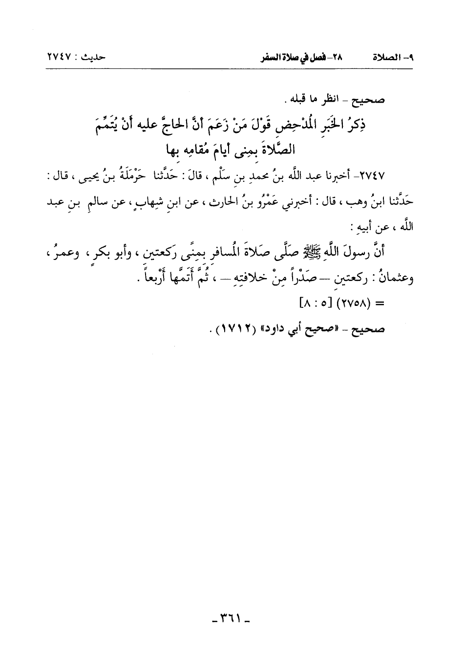 2747 - أَخْبَرَنَا عَبْدُ اللَّهِ بْنُ مُحَمَّدِ بْنِ سَلْمٍ قَالَ: حَدَّثَنَا حَرْمَلَةُ بْنُ يَحْيَى قَالَ: حَدَّثَنَا ابْنُ وَهْبٍ قَالَ: أَخْبَرَنِي عَمْرُو بْنُ الْحَارِثِ عَنِ ابْنِ شِهَابٍ عَنْ سَالِمِ بْنِ عَبْدِ اللَّهِ عَنْ أَبِيهِ: