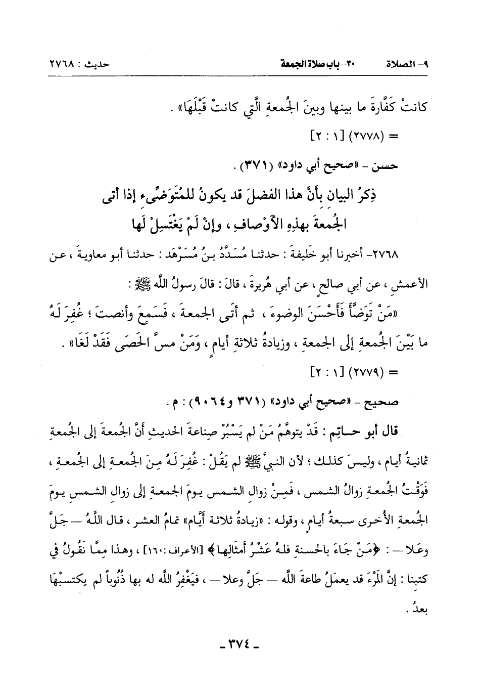 قَالَ أَبُو حَاتِمٍ: قَدْ يَتَوَهَّمُ مَنْ لَمْ يَسْبُرْ صِنَاعَةَ الْحَدِيثِ أَنَّ الْجُمُعَةَ إِلَى الْجُمُعَةِ ثَمَانِيَةُ أَيَّامٍ وَلَيْسَ كَذَلِكَ لِأَنَّ النَّبِيَّ صَلَّى اللَّهُ عَلَيْهِ وَسَلَّمَ لَمْ يَقُلْ: غُفِرَ لَهُ مِنَ الْجُمُعَةِ إِلَى الْجُمُعَةِ فَوَقْتُ الْجُمُعَةِ زَوَالُ الشَّمْسِ فَمِنْ زَوَالِ الشَّمْسِ يَوْمَ الْجُمُعَةِ إِلَى زَوَالِ الشَّمْسِ يَوْمَ الْجُمُعَةِ الْأُخْرَى سَبْعَةُ أَيَّامٍ وَقَوْلُهُ: (زِيَادَةُ ثَلَاثَةِ أَيَّامٍ) تَمَامُ الْعَشْرِ قَالَ الله جل وعلا {من جاء بالحسنة فله عشر أمثالها} [الأعراف: 160] وَهَذَا مِمَّا نَقُولُ فِي كُتُبِنَا: إِنَّ الْمَرْءَ قَدْ يَعْمَلُ طَاعَةَ اللَّهِ جَلَّ وَعَلَا فيَغْفِرُ اللَّهُ لَهُ بِهَا ذَنُوبًا لَمْ يَكْتَسِبْهَا بَعْدُ