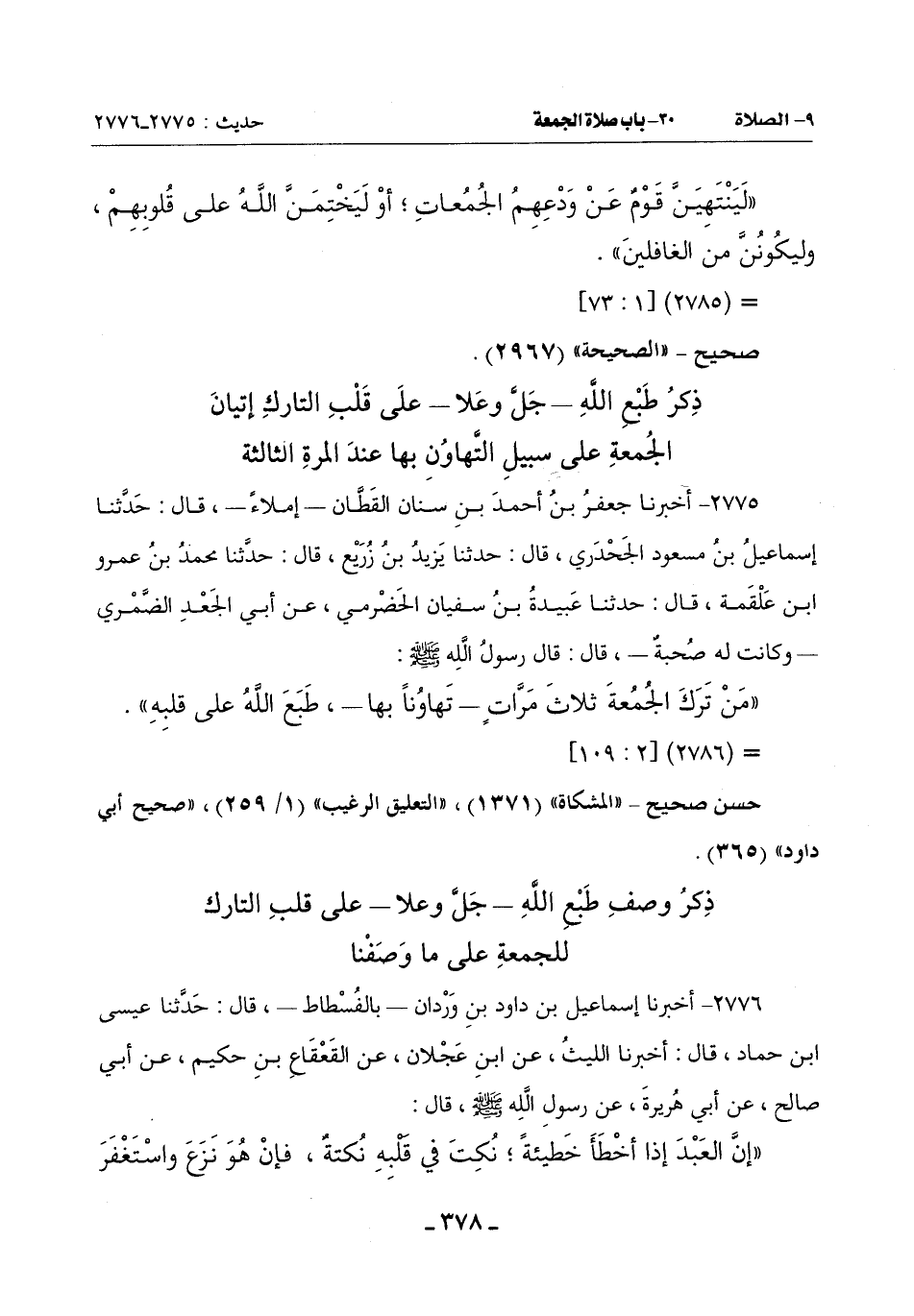 (مَنْ تَرَكَ الْجُمُعَةَ ثَلَاثَ مَرَّاتٍ ـ تَهَاوُنًا بِهَا ـ طَبَعَ اللَّهُ على قلبه)