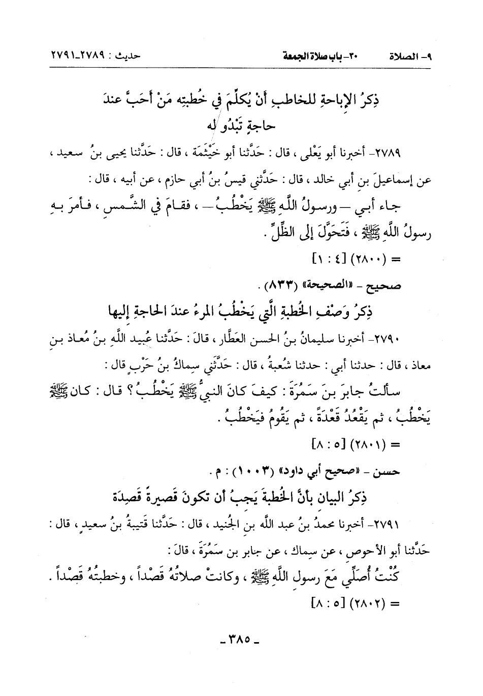 سَأَلْتُ جَابِرَ بْنَ سَمُرَةَ: كَيْفَ كَانَ النَّبِيُّ صَلَّى اللَّهُ عَلَيْهِ وَسَلَّمَ يَخْطُبُ؟ قَالَ: كَانَ صَلَّى اللَّهُ عَلَيْهِ وَسَلَّمَ يَخْطُبُ ثُمَّ يَقْعُدُ قَعْدَةً ثُمَّ يَقُومُ فَيَخْطُبُ