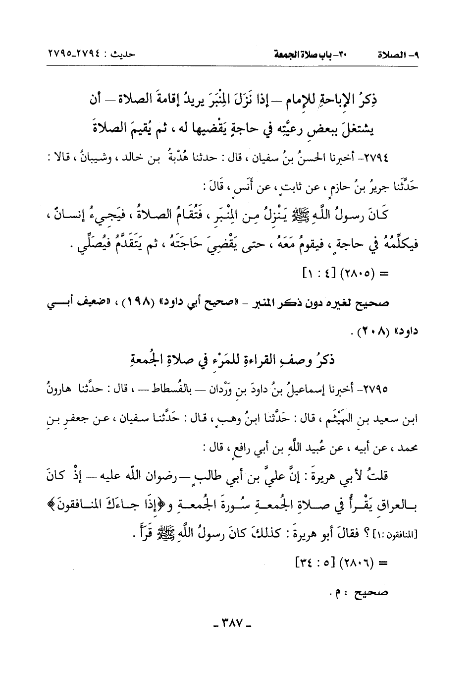 2795 - أَخْبَرَنَا إِسْمَاعِيلُ بْنُ دَاوُدَ بْنِ وَرْدَانَ بِالْفُسْطَاطِ قَالَ: حَدَّثَنَا هَارُونُ بْنُ سَعِيدِ بْنِ الْهَيْثَمِ قَالَ: حَدَّثَنَا ابْنُ وَهْبٍ قَالَ: حَدَّثَنَا سُفْيَانُ عَنْ جَعْفَرِ بْنِ مُحَمَّدٍ عَنْ أَبِيهِ عَنْ عُبَيْدِ اللَّهِ بْنِ أَبِي رَافِعٍ قَالَ: