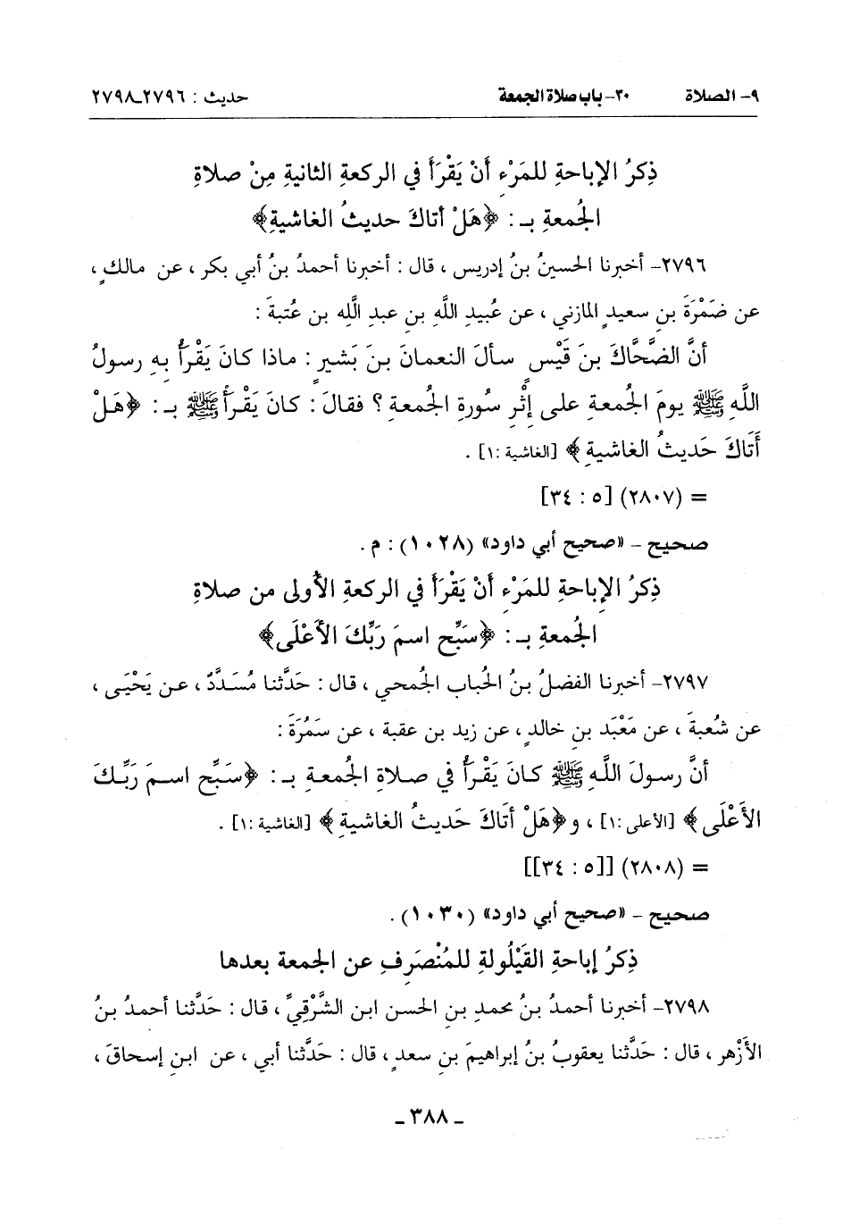 أَنَّ الضَّحَّاكَ بْنَ قَيْسٍ سَأَلَ النُّعْمَانَ بْنَ بَشِيرٍ: مَاذَا كَانَ يَقْرَأُ بِهِ رَسُولُ اللَّهِ صَلَّى اللَّهُ عَلَيْهِ وَسَلَّمَ يَوْمَ الْجُمُعَةِ عَلَى إِثْرِ سُورَةِ الْجُمُعَةِ؟ فَقَالَ: كَانَ يَقْرَأُ صَلَّى اللَّهُ عَلَيْهِ وَسَلَّمَ بـ {هل أتاك حديث الغاشية} [الغاشية: 1]