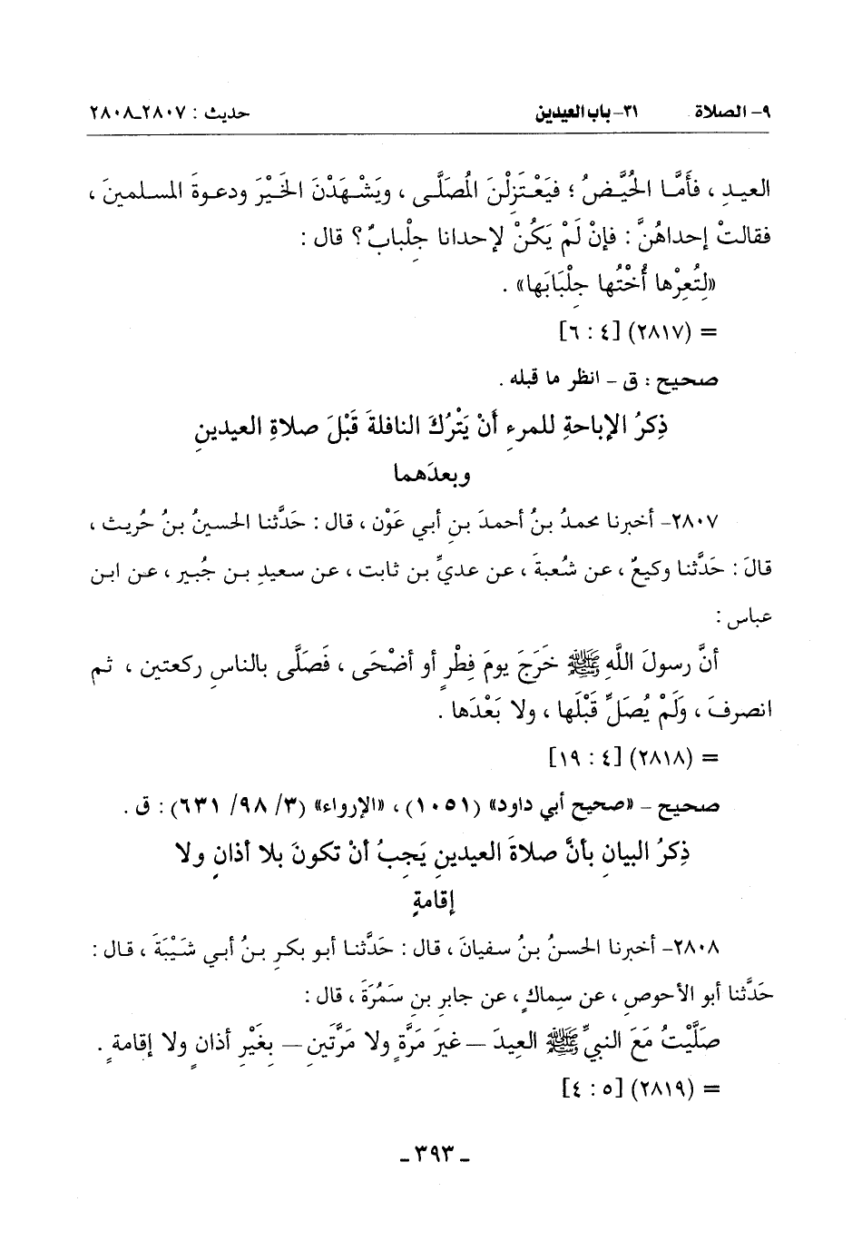 صَلَّيْتُ مَعَ النَّبِيِّ صَلَّى اللَّهُ عَلَيْهِ وَسَلَّمَ الْعِيدَ ـ غَيْرَ مَرَّةٍ وَلَا مَرَّتَيْنِ ـ بغير أذان ولا إقامة