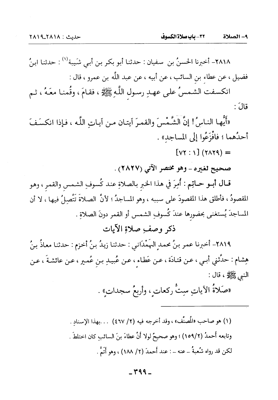 2818 - أَخْبَرَنَا الْحَسَنُ بْنُ سُفْيَانَ حَدَّثَنَا أَبُو بَكْرِ بْنُ أَبِي شَيْبَةَ (¬1): حَدَّثَنَا ابْنُ فُضَيْلٍ عَنْ عَطَاءِ بْنِ السَّائِبِ عَنْ أَبِيهِ عَنْ عَبْدِ اللَّهِ بْنِ عَمْرٍو قَالَ:
