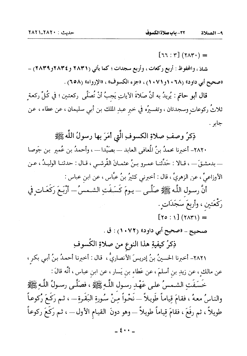 قَالَ أَبُو حَاتِمٍ ـ رَضِيَ اللَّهُ عَنْهُ ـ: أَنْوَاعُ صَلَاةِ الْكُسُوفِ سَنَذْكُرُهَا ـ فِيمَا بَعْدُ ـ بِالتَّفْصِيلِ فِي الْقِسْمِ الْخَامِسِ فِي نَوْعِ الْأَفْعَالِ الَّتِي هِيَ مِنِ اخْتِلَافِ الْمُبَاحِ إِنَّ شَاءَ اللَّهُ ذَلِكَ ويسره