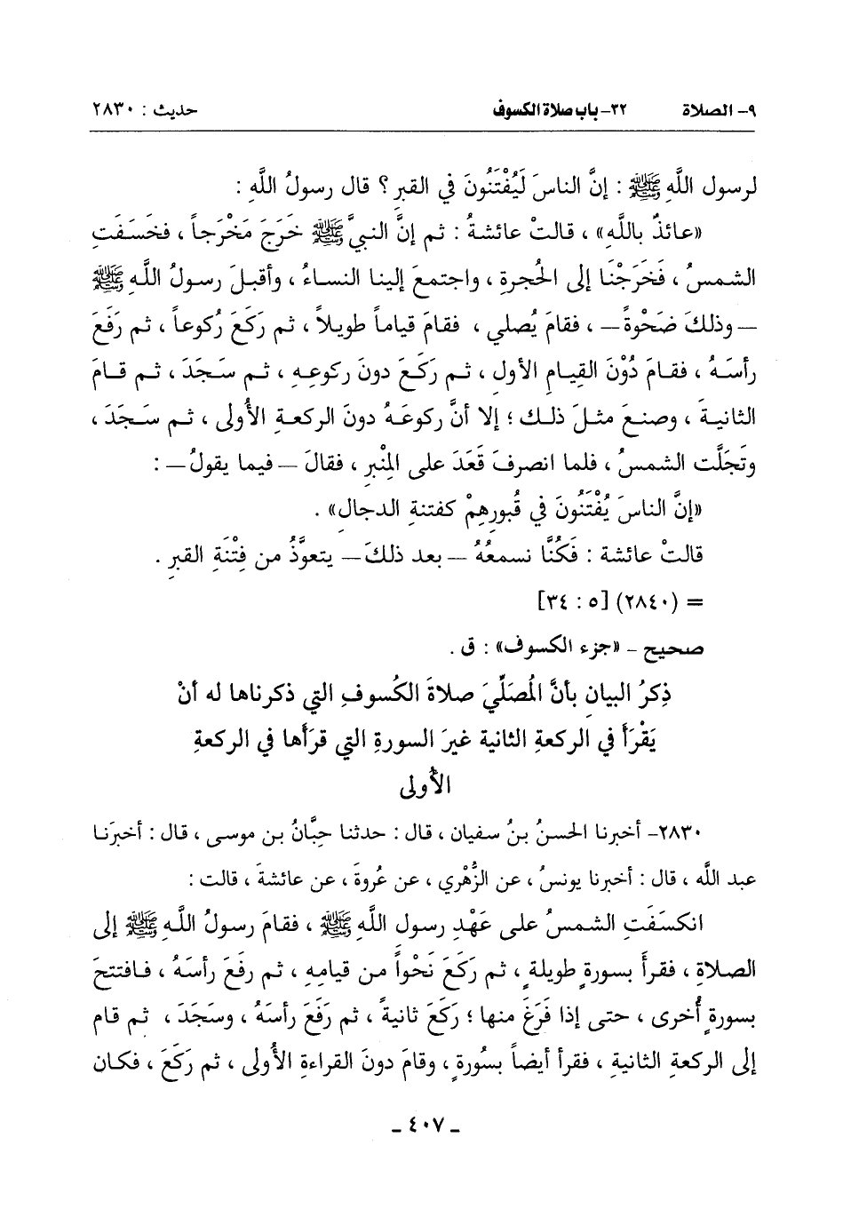 ذِكْرُ الْبَيَانِ بِأَنَّ الْمُصَلِّي صَلَاةَ الْكُسُوفِ الَّتِي ذَكَرْنَاهَا لَهُ أَنْ يَقْرَأَ فِي الرَّكْعَةِ الثَّانِيَةِ غَيْرَ السُّورَةِ الَّتِي قَرَأَهَا فِي الرَّكْعَةِ الْأُولَى