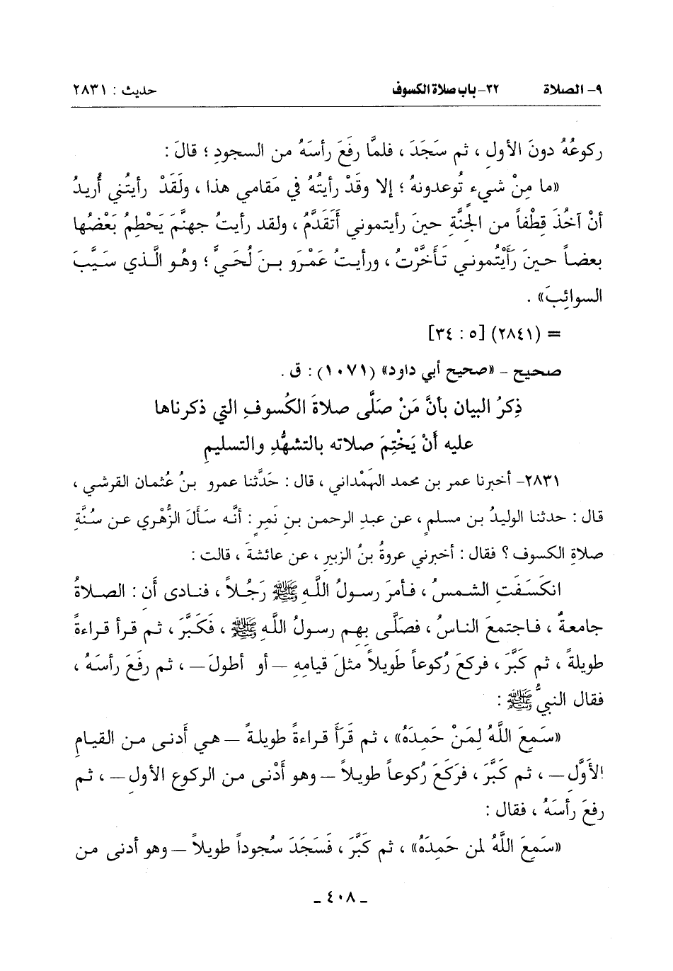 2831 - أَخْبَرَنَا عُمَرُ بْنُ مُحَمَّدٍ الْهَمْدَانِيُّ قَالَ: حَدَّثَنَا عَمْرُو بْنُ عُثْمَانَ الْقُرَشِيُّ قَالَ: حَدَّثَنَا الْوَلِيدُ بْنُ مُسْلِمٍ عَنْ عَبْدِ الرَّحْمَنِ بْنِ نَمِرٍ أَنَّهُ سَأَلَ الزُّهْرِيَّ عَنْ سُنَّةِ صَلَاةِ الْكُسُوفِ فَقَالَ: أَخْبَرَنِي عُرْوَةُ بْنُ الزُّبَيْرِ عَنْ عَائِشَةَ قَالَتْ:
