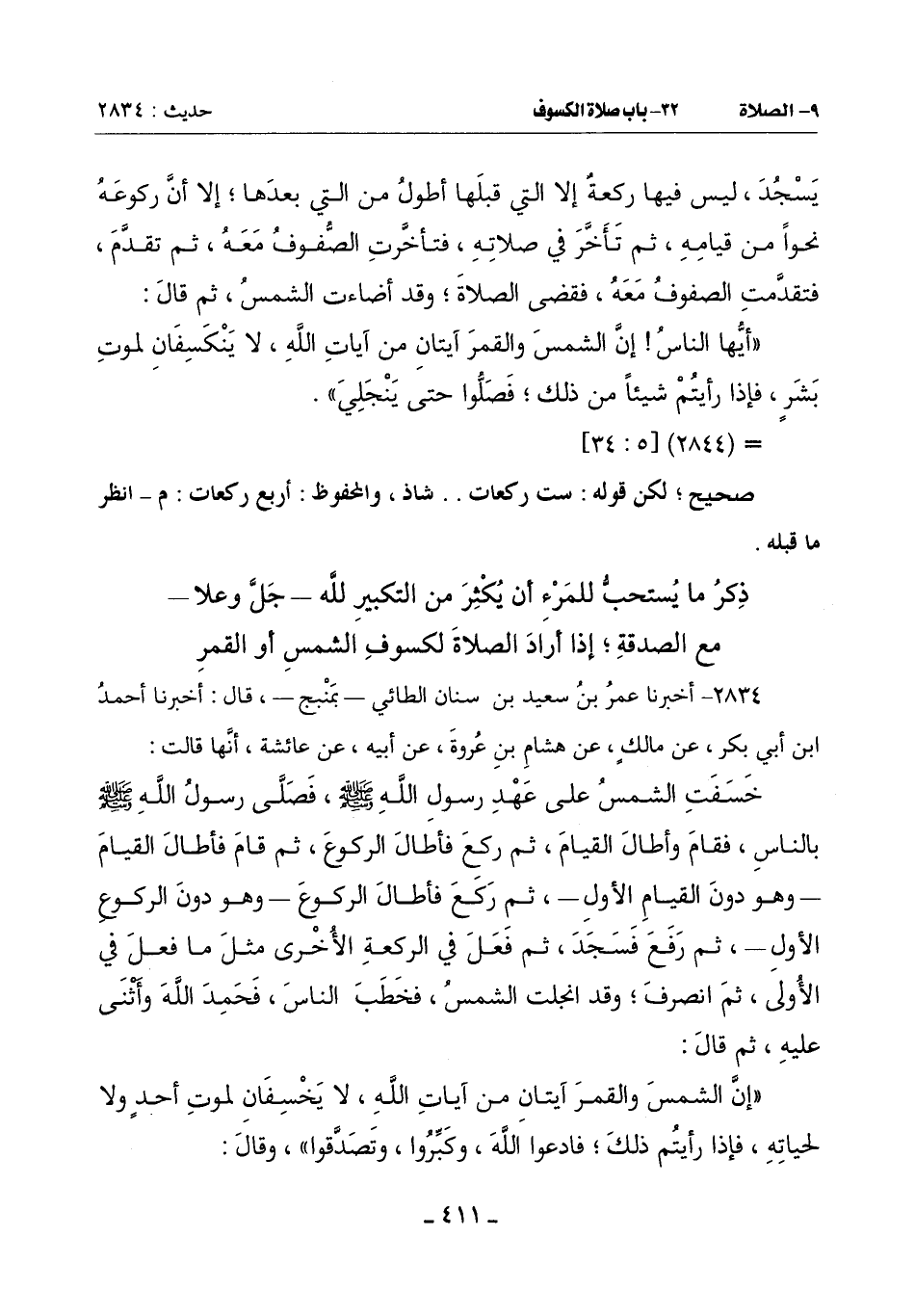 (إِنَّ الشَّمْسَ وَالْقَمَرِ آيَتَانِ مِنْ آيَاتِ اللَّهِ لَا يَخْسِفَانِ لِمَوْتِ أَحَدٍ وَلَا لِحَيَاتِهِ فَإِذَا رَأَيْتُمْ ذَلِكَ فَادْعُوا اللَّهَ وَكَبِّرُوا وَتَصَدَّقُوا وَقَالَ: -[412]-