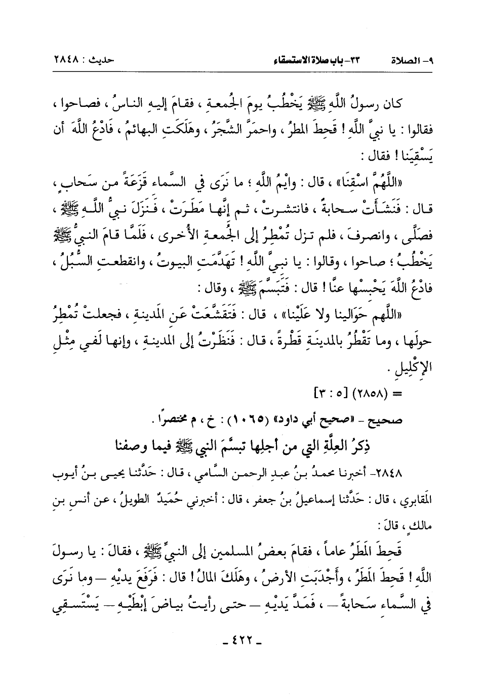 قَحِطَ الْمَطَرُ عَامًا فَقَامَ بَعْضُ الْمُسْلِمِينَ إِلَى النَّبِيِّ صَلَّى اللَّهُ عَلَيْهِ وَسَلَّمَ فَقَالَ: يَا رَسُولَ اللَّهِ قَحِطَ الْمَطَرُ وَأَجْدَبَتِ الْأَرْضُ وَهَلَكَ الْمَالُ قَالَ: فَرَفَعَ يَدَيْهِ ـ وَمَا نَرَى فِي السَّمَاءِ سَحَابَةً ـ فَمَدَّ يَدَيْهِ ـ حَتَّى رَأَيْتُ بَيَاضَ إِبْطَيْهِ ـ يَسْتَسْقِي -[423]- اللَّهَ فَمَا صَلَّيْنَا الْجُمُعَةَ حَتَّى أَهَمَّ الشَّابَّ الْقَرِيبَ الدَّارِ الرُّجُوعُ إِلَى أَهْلِهِ فَدَامَتْ جُمُعَةً فَلَمَّا كَانَتِ الْجُمُعَةُ الَّتِي تَلِيهَا قَالَ: يَا رَسُولَ اللَّهِ تَهَدَّمَتِ الْبُيُوتُ وَاحْتَبَسَ الرُّكْبَانُ قَالَ: فَتَبَسَّمَ صَلَّى اللَّهُ عَلَيْهِ وَسَلَّمَ ـ لِسُرْعَةِ مَلَالَةِ ابْنِ آدَمَ ـ وَقَالَ بِيَدَيْهِ: