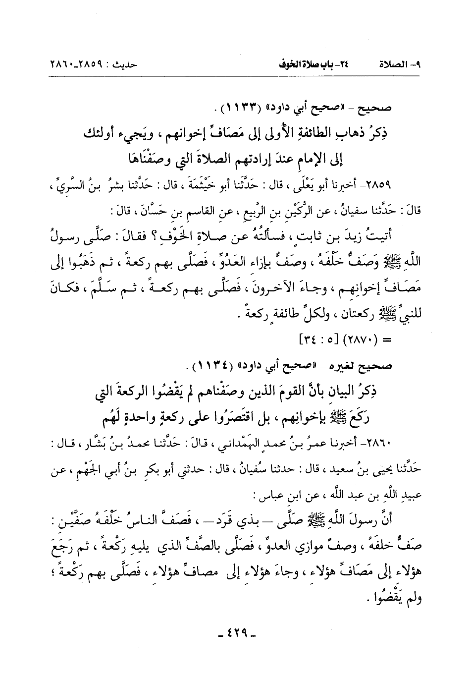 أَنَّ رَسُولَ اللَّهِ صَلَّى اللَّهُ عَلَيْهِ وَسَلَّمَ صَلَّى ـ بِذِي قَرَد ـ فَصَفَّ النَّاسُ خَلْفَهُ صَفَّيْنِ: صَفٌّ خَلْفَهُ وصَفٌّ مُوَازِي الْعَدُوِّ فَصَلَّى بِالصَّفِّ الَّذِي يَلِيهِ رَكْعَةً ثُمَّ رَجَعَ هَؤُلَاءِ إِلَى مَصَافِّ هَؤُلَاءِ وَجَاءَ هَؤُلَاءِ إِلَى مَصَافِّ هَؤُلَاءِ فَصَلَّى بهم ركعة ولم يقضوا -[430]-