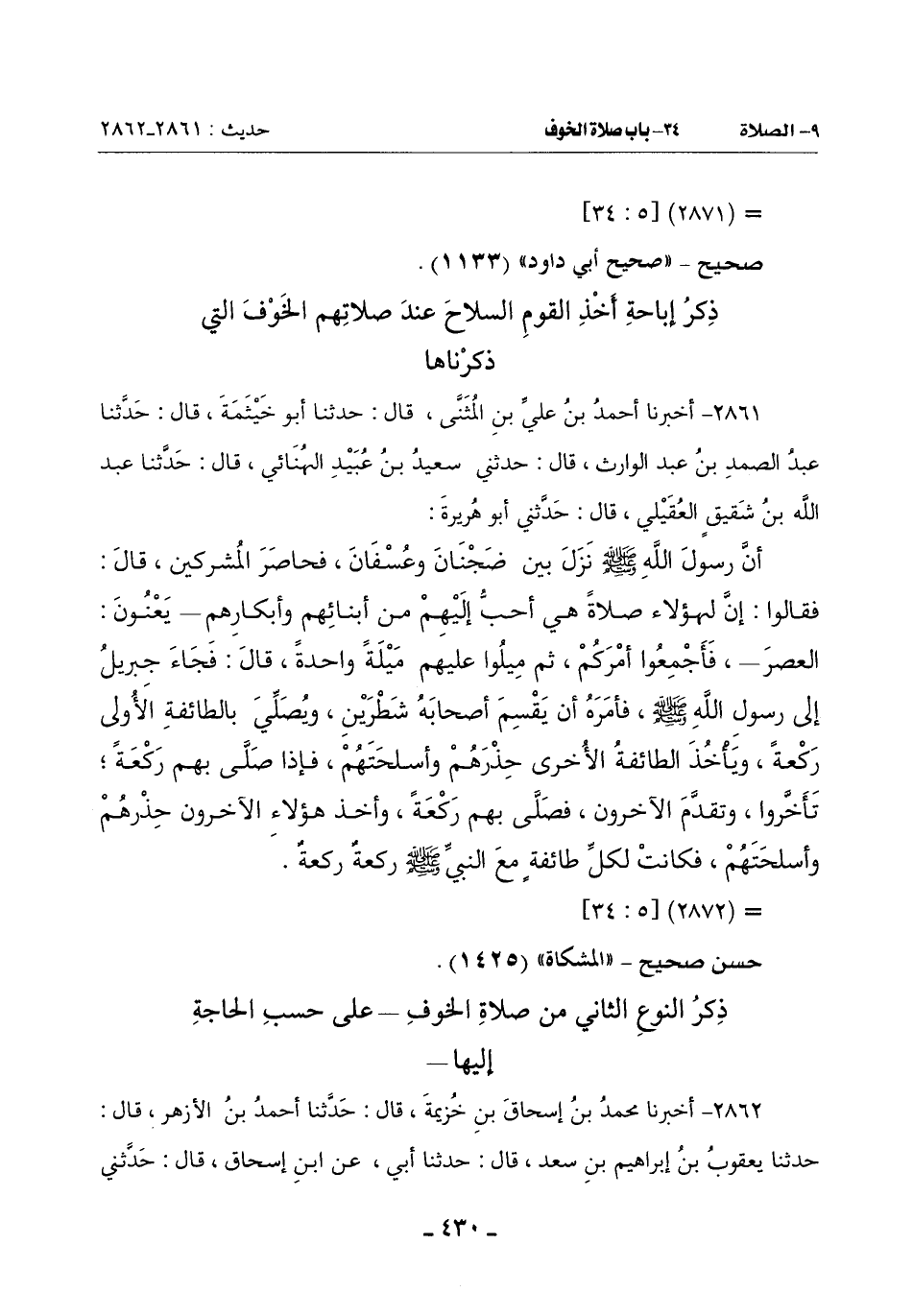 أَنَّ رَسُولَ اللَّهِ صَلَّى اللَّهُ عَلَيْهِ وَسَلَّمَ نَزَلَ بَيْنَ ضُجْنَانَ وَعُسْفَانَ فَحَاصَرَ الْمُشْرِكِينَ قَالَ: فَقَالُوا: إِنَّ لِهَؤُلَاءِ صَلَاةً هِيَ أَحَبُّ إِلَيْهِمْ مِنْ أَبْنَائِهِمْ وَأَبْكَارِهِمْ - يَعْنُونَ الْعَصْرَ - فأجمِعُوا أَمْرَكُمْ ثُمَّ مِيلُوا عَلَيْهِمْ مَيْلَةً وَاحِدَةً قَالَ: فَجَاءَ جِبْرِيلُ إِلَى رَسُولِ اللَّهِ صَلَّى اللَّهُ عَلَيْهِ وسلم فَأَمَرَهُ أَنْ يَقْسِمَ أَصْحَابَهُ شَطْرَيْنِ وَيُصَلِّيَ بِالطَّائِفَةِ الْأُولَى رَكْعَةً وَيَأْخُذُ الطَّائِفَةُ الْأُخْرَى حِذرهم وَأَسْلِحَتَهُمْ فَإِذَا صَلَّى بِهِمْ رَكْعَةً تَأَخَّرُوا وَتَقَدَّمَ الْآخَرُونَ فَصَلَّى بِهِمْ رَكْعَةً وَأَخَذَ هَؤُلَاءِ الْآخَرُونَ حِذرهم وَأَسْلِحَتَهُمْ فَكَانَتْ لِكُلِّ طَائِفَةٍ مَعَ النَّبِيِّ صَلَّى الله عليه وسلم ركعة ركعة
