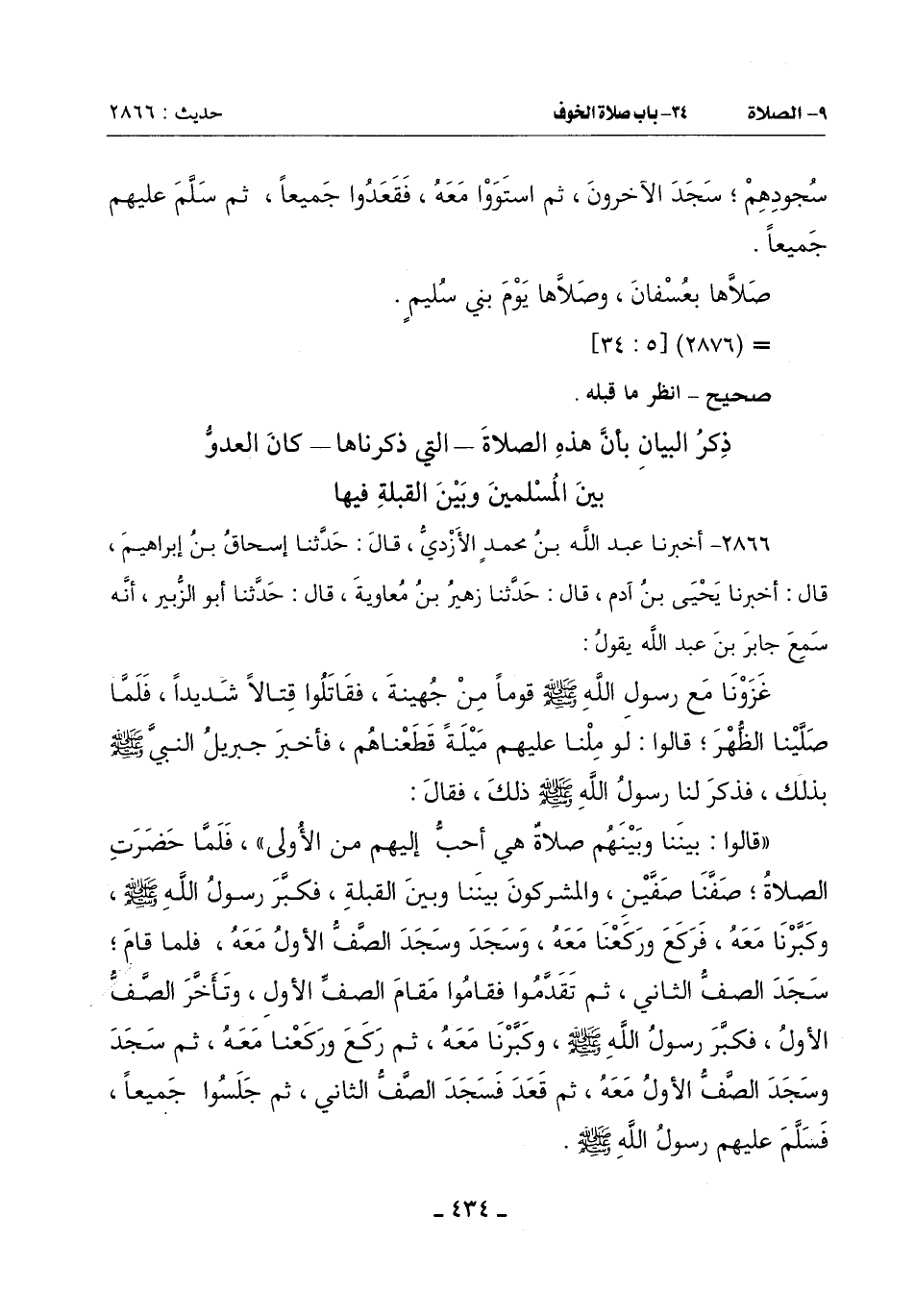 قَالُوا: بَيْنَنَا وَبَيْنَهُمْ صَلَاةٌ هِيَ أَحَبُّ إِلَيْهِمْ مِنَ الْأُولَى فَلَمَّا حَضَرَتِ الصَّلَاةُ صَفَّنَا صَفَّين وَالْمُشْرِكُونَ بَيْنَنَا وَبَيْنَ الْقِبْلَةِ فَكَبَّرَ رَسُولُ اللَّهِ صَلَّى اللَّهُ عَلَيْهِ وَسَلَّمَ وَكَبَّرْنَا مَعَهُ فَرَكَعَ وَرَكَعْنَا مَعَهُ وَسَجَدَ وَسَجَدَ الصَّفُّ الْأَوْلُ مَعَهُ فَلَمَّا قَامَ سَجَدَ الصَّفُّ الثَّانِي ثُمَّ تَقَدَّمُوا فَقَامُوا مَقَامَ الصَّفِّ الْأَوْلِ وَتَأَخَّرَ الصَّفُّ الْأَوْلُ فَكَبَّرَ رَسُولُ اللَّهِ صَلَّى اللَّهُ عَلَيْهِ وَسَلَّمَ وَكَبَّرْنَا مَعَهُ ثُمَّ رَكَعَ وَرَكَعْنَا مَعَهُ ثُمَّ سَجَدَ وَسَجَدَ الصَّفُّ الْأَوْلُ مَعَهُ ثُمَّ قَعَدَ فَسَجَدَ الصَّفُّ الثَّانِي ثُمَّ جَلَسُوا جَمِيعًا فَسَلَّمَ عَلَيْهِمْ رَسُولُ اللَّهِ صَلَّى اللَّهُ عَلَيْهِ وَسَلَّمَ -[435]-