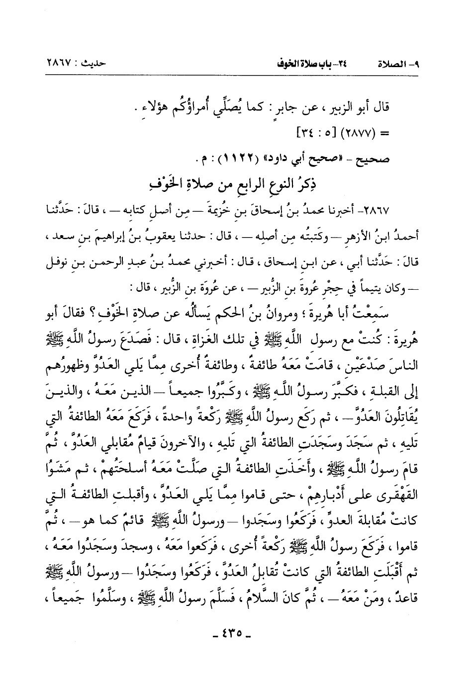 سَمِعْتُ أَبَا هُرَيْرَةَ وَمَرْوَانُ بْنُ الْحَكَمِ يَسْأَلُهُ عَنْ صَلَاةِ الْخَوْفِ فَقَالَ أَبُو هُرَيْرَةَ: كُنْتُ مَعَ رَسُولِ اللَّهِ صَلَّى اللَّهُ عَلَيْهِ وَسَلَّمَ فِي تِلْكَ الْغَزَاةِ قَالَ: فَصَدَعَ رَسُولُ اللَّهِ صَلَّى اللَّهُ عَلَيْهِ وَسَلَّمَ النَّاسَ صَدْعَيْنِ قَامَتْ مَعَهُ طَائِفَةٌ وَطَائِفَةٌ أُخْرَى مِمَّا يَلِي الْعَدُوَّ وَظُهُورُهُمْ إِلَى الْقِبْلَةِ فَكَبَّرَ رَسُولُ اللَّهِ صَلَّى اللَّهُ عَلَيْهِ وَسَلَّمَ وَكَبَّرُوا جَمِيعًا ـ الَّذِينَ مَعَهُ وَالَّذِينَ يُقَاتِلُونَ الْعَدُوَّ ـ ثُمَّ رَكَعَ رَسُولُ اللَّهِ صَلَّى اللَّهُ عَلَيْهِ وَسَلَّمَ رَكْعَةً وَاحِدَةً فَرَكَعَ مَعَهُ الطَّائِفَةُ الَّتِي تَلِيهِ ثُمَّ سَجَدَ وَسَجَدَتِ الطَّائِفَةُ الَّتِي تَلِيهِ وَالْآخَرُونَ قِيَامٌ مُقَابِلِي الْعَدُوِّ ثُمَّ قَامَ رَسُولُ اللَّهِ صَلَّى اللَّهُ عَلَيْهِ وَسَلَّمَ وَأَخَذْتِ الطَّائِفَةُ الَّتِي صَلَّتْ مَعَهُ أَسْلِحَتَهُمْ ثُمَّ مَشَوَا الْقَهْقَرَى عَلَى أَدْبَارِهِمْ حَتَّى قَامُوا مِمَّا يَلِي الْعَدُوَّ وَأَقْبَلَتِ الطَّائِفَةُ الَّتِي كَانَتْ مُقَابَلَةَ الْعَدُوِّ فَرَكَعُوا وَسَجَدُوا ـ وَرَسُولُ اللَّهِ صَلَّى اللَّهُ عَلَيْهِ وَسَلَّمَ قَائِمٌ كَمَا هُوَ ـ ثُمَّ قَامُوا فَرَكَعَ رَسُولُ اللَّهِ صَلَّى اللَّهُ عَلَيْهِ وَسَلَّمَ رَكْعَةً أُخْرَى فَرَكَعُوا مَعَهُ وَسَجَدَ وَسَجَدُوا مَعَهُ ثُمَّ أَقْبَلَتِ الطَّائِفَةُ الَّتِي كَانَتْ تُقَابِلُ العدو فركعوا وسجدوا ـ وَرَسُولُ اللَّهِ صَلَّى اللَّهُ عَلَيْهِ وَسَلَّمَ قَاعِدٌ وَمَنْ مَعَهُ ـ ثُمَّ كَانَ السَّلَامُ فسلَّم رَسُولُ اللَّهِ صَلَّى اللَّهُ عَلَيْهِ وَسَلَّمَ وسلَّموا جَمِيعًا -[436]- فَقَامَ الْقَوْمُ وَقَدْ شَرَكُوهُ في الصلاة