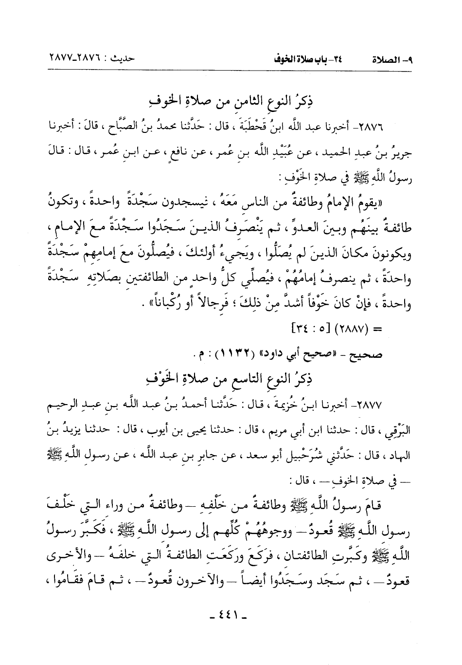 2876 - أَخْبَرَنَا عَبْدُ اللَّهِ بْنُ قَحْطَبَةَ قَالَ: حَدَّثَنَا مُحَمَّدُ بْنُ الصَّبَّاحِ قَالَ: أَخْبَرَنَا جَرِيرُ بْنُ عَبْدِ الْحَمِيدِ عَنْ عُبَيْدِ اللَّهِ بْنِ عُمَرَ عَنْ نَافِعٍ عَنِ ابْنِ عُمَرَ قَالَ: قَالَ رَسُولُ اللَّهِ صَلَّى اللَّهُ عَلَيْهِ وَسَلَّمَ فِي صَلَاةِ الْخَوْفِ: