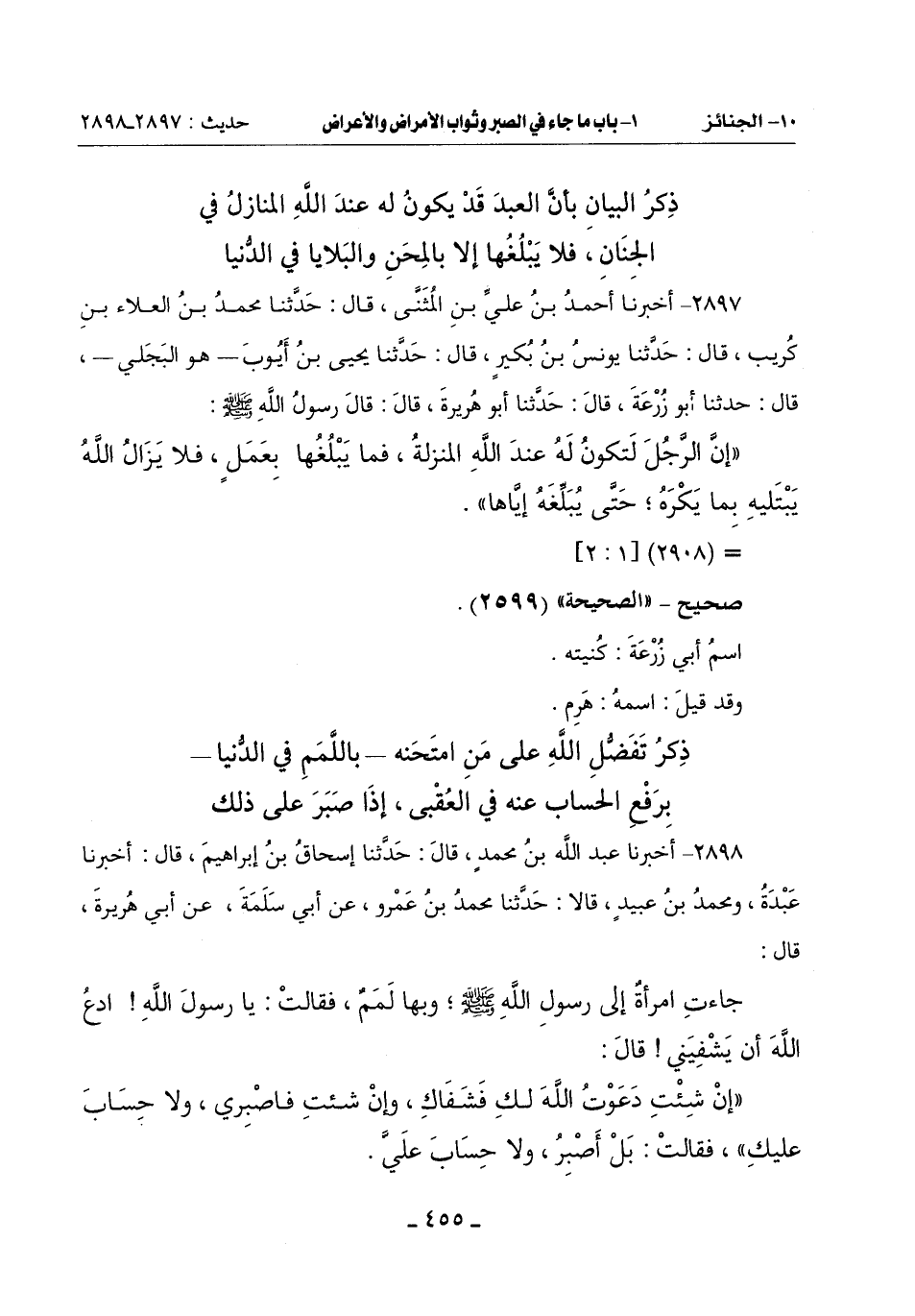 ذِكْرُ الْبَيَانِ بِأَنَّ الْعَبْدَ قَدْ يَكُونُ لَهُ عِنْدَ اللَّهِ الْمَنَازِلُ فِي الْجِنَّانِ فَلَا يَبْلُغُهَا إِلَّا بِالْمِحَنِ وَالْبَلَايَا فِي الدُّنْيَا