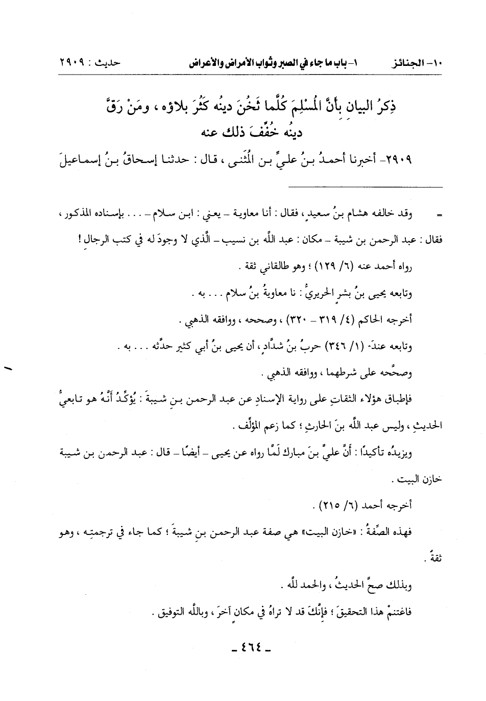 (الْأَنْبِيَاءُ ثُمَّ الْأَمْثَلُ فَالْأَمْثَلُ يُبتلى النَّاسُ عَلَى قَدْرِ دِينِهِمْ فَمَنْ ثَخُنَ دِينُهُ اشْتَدَّ بَلَاؤُهُ وَمَنْ ضَعُفَ دِينُهُ ضَعُفَ بَلَاؤُهُ وَإِنَّ الرَّجُلَ لِيُصِيبَهُ الْبَلَاءُ حَتَّى يمشي في الناس ما عليه خطيئة)