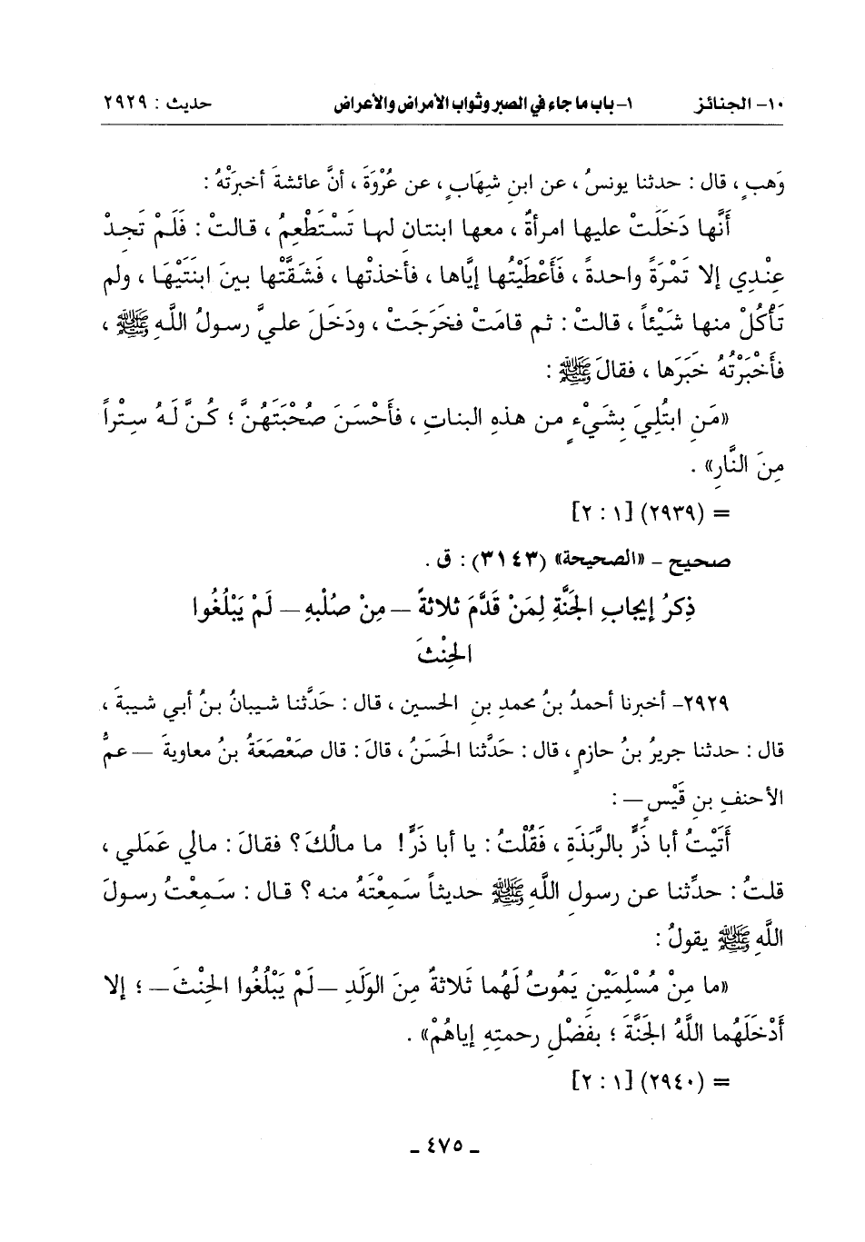 (مَا مِنْ مُسْلِمَيْنِ يَمُوتُ لَهُمَا ثَلَاثَةٌ مِنَ الْوَلَدِ ـ لَمْ يَبْلُغُوا الْحِنْثَ ـ إِلَّا أَدْخَلَهُمَا اللَّهُ الْجَنَّةَ بفضل رحمته إياهم)