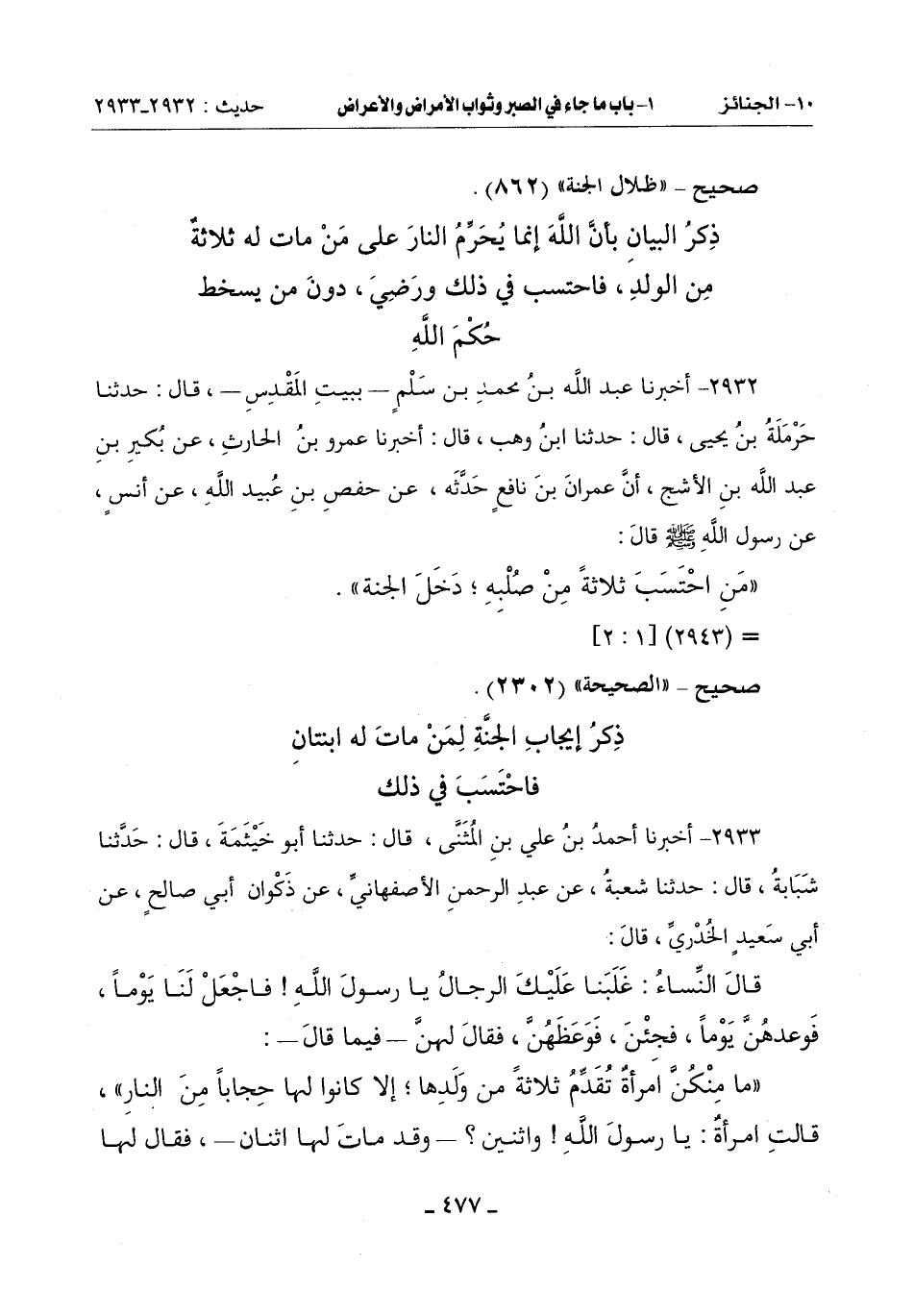(مَا مِنْكُنَّ امْرَأَةٌ تُقَدِّمُ ثَلَاثَةً مِنْ وَلَدِهَا إِلَّا كَانُوا لَهَا حِجَابًا مِنَ النَّارِ) قَالَتِ امْرَأَةٌ: يَا رَسُولَ اللَّهِ وَاثْنَيْنِ؟ ـ وَقَدْ مَاتَ لَهَا اثْنَانِ ـ فَقَالَ لَهَا -[478]- النَّبِيُّ صَلَّى اللَّهُ عَلَيْهِ وَسَلَّمَ: