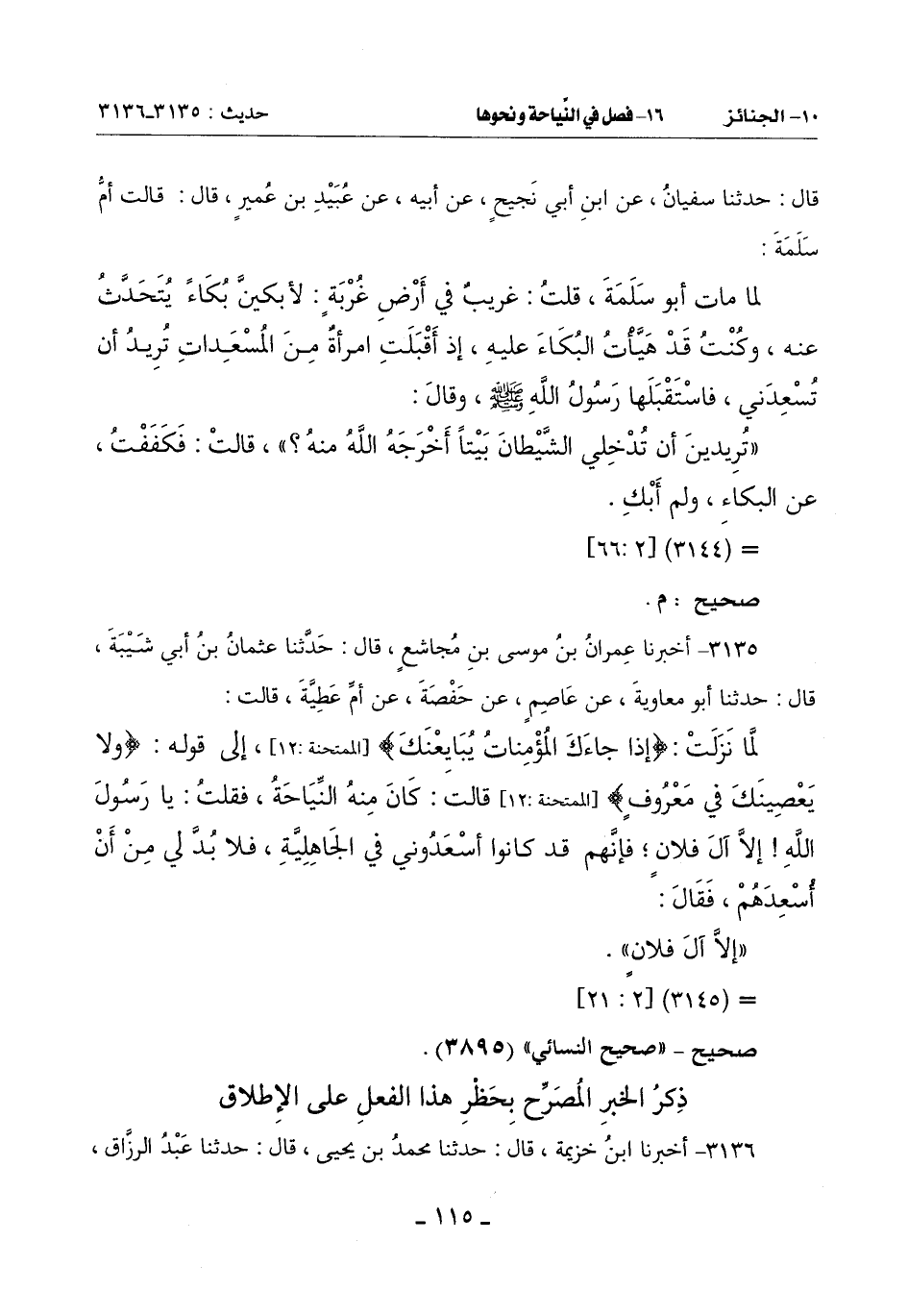 3135 - أَخْبَرَنَا عِمْرَانُ بْنُ مُوسَى بْنِ مُجَاشِعٍ قَالَ: حَدَّثَنَا عُثْمَانُ بْنُ أَبِي شَيْبَةَ قَالَ: حَدَّثَنَا أَبُو مُعَاوِيَةَ عَنْ عَاصِمٍ عَنْ حَفْصَةَ: عَنْ أُمِّ عَطِيَّةَ قَالَتْ: