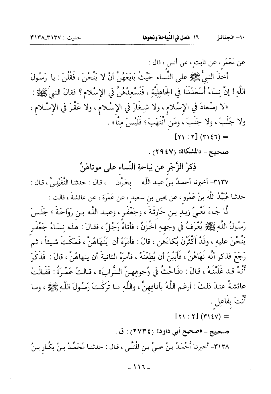 3138 - أَخْبَرَنَا أَحْمَدُ بْنُ عَلِيِّ بْنِ الْمُثَنَّى قَالَ: حَدَّثَنَا مُحَمَّدُ بْنُ بَكَّارِ بْنِ -[117]- الرَّيَّانِ قَالَ: حَدَّثَنَا مُحَمَّدُ بْنُ طَلْحَةِ بْنِ مُصَرِّفٍ عَنِ الْحَكَمِ بْنِ عُتَيْبَةَ عَنْ عَبْدُ اللَّهِ بْنُ شَدَّادِ بْنِ الْهَادِ عَنْ أَسْمَاءَ بِنْتِ عُمَيْسٍ أَنَّهَا قَالَتْ:
