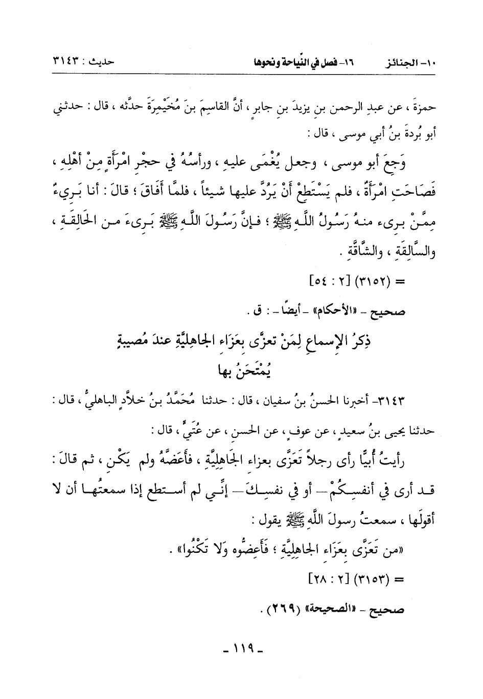 3143 - أَخْبَرَنَا الْحَسَنُ بْنُ سُفْيَانَ قَالَ: حَدَّثَنَا مُحَمَّدُ بْنُ خَلَّادٍ الْبَاهِلِيُّ قَالَ: حَدَّثَنَا يَحْيَى بْنُ سَعِيدٍ عَنْ عَوْفٍ عَنِ الْحَسَنِ عَنْ عُتَيٍّ قَالَ: