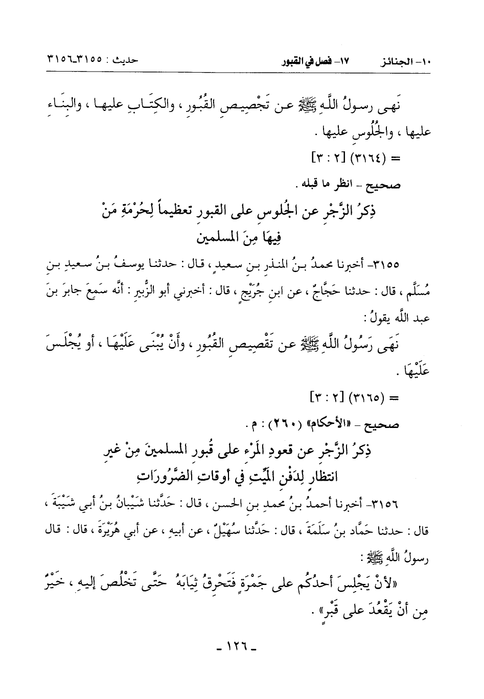 (لأنْ يَجْلِسَ أَحَدُكُمْ عَلَى جَمْرَةٍ فَتُحْرِقَ ثِيَابَهُ حَتَّى تَخْلُصَ إِلَيْهِ خَيْرٌ مِنْ أَنْ يَقْعُدَ عَلَى قَبْرٍ) -[127]-