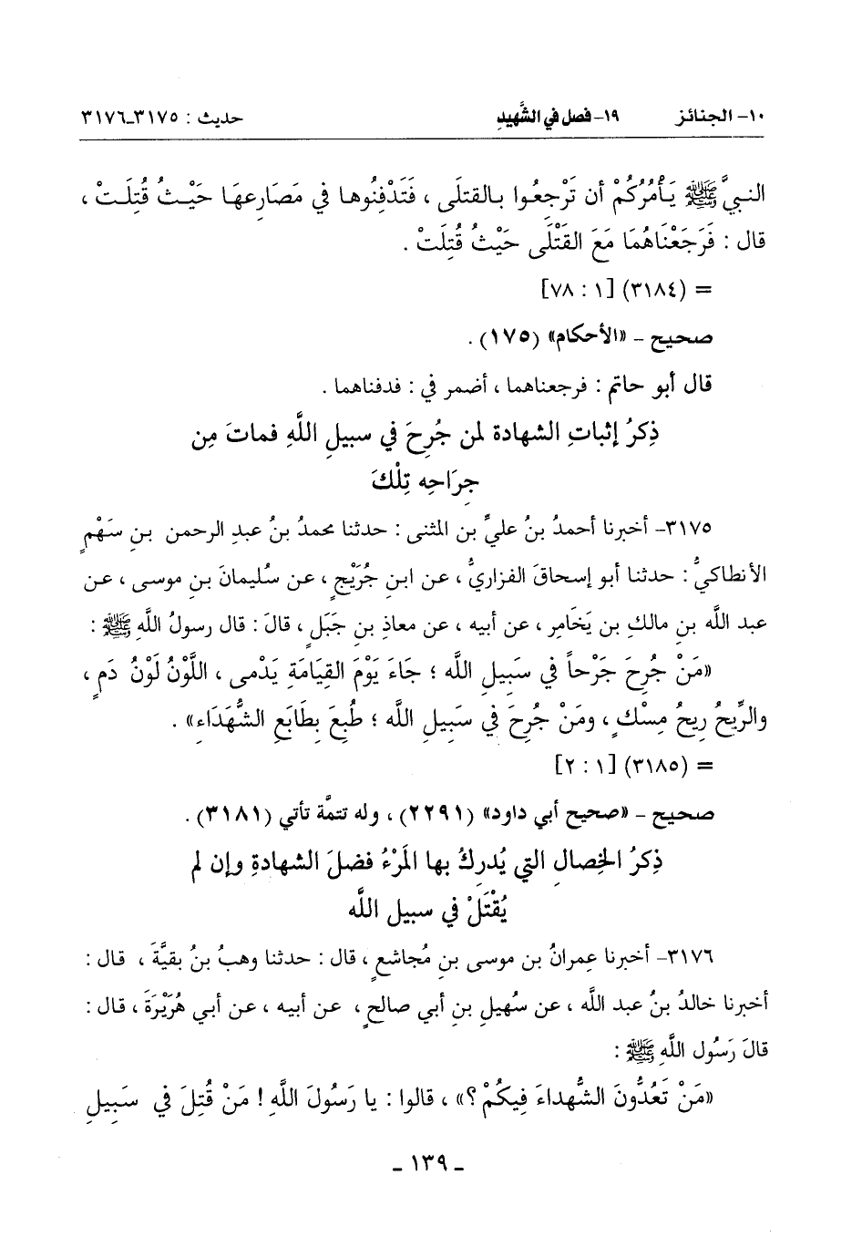 (مَنْ جُرح جُرْحًا فِي سَبِيلِ اللَّهِ جَاءَ يَوْمَ الْقِيَامَةِ يَدْمَى اللَّوْنُ لَوْنُ دَمٍ وَالرِّيحُ رِيحِ مِسْكٍ وَمَنْ جُرِحَ فِي سَبِيلِ اللَّهِ طُبِعَ بِطَابَعِ الشُّهَدَاءِ)