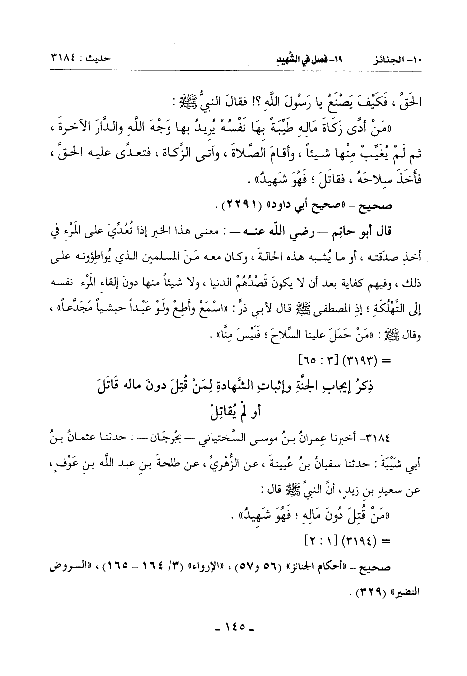 ذِكْرُ إِيجَابِ الْجَنَّةِ وَإِثْبَاتِ الشَّهَادَةِ لِمَنْ قُتِلَ دُونَ مَالِهِ قَاتَلَ أَوْ لَمْ يُقَاتِلْ
