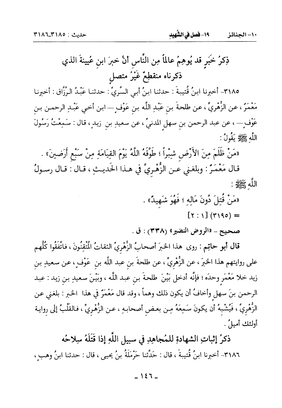 3185 - أَخْبَرَنَا ابْنُ قُتَيْبَةَ حَدَّثَنَا ابْنُ أَبِي السَّرِيِّ حَدَّثَنَا عَبْدُ الرَّزَّاقِ أَخْبَرَنَا مَعْمَرٌ عَنِ الزُّهْرِيِّ عَنْ طَلْحَةَ بْنِ عَبْدِ اللَّهِ بْنِ عَوْفٍ ـ ابْنِ أَخِي عَبْدِ الرَّحْمَنِ بْنِ عَوْفٍ ـ عَنْ عَبْدِ الرَّحْمَنِ بْنِ سَهْلٍ الْمَدَنِيِّ عَنْ سَعِيدِ بْنِ زَيْدٍ قَالَ: سَمِعْتُ رَسُولَ اللَّهِ صَلَّى اللَّهُ عَلَيْهِ وَسَلَّمَ يَقُولُ: