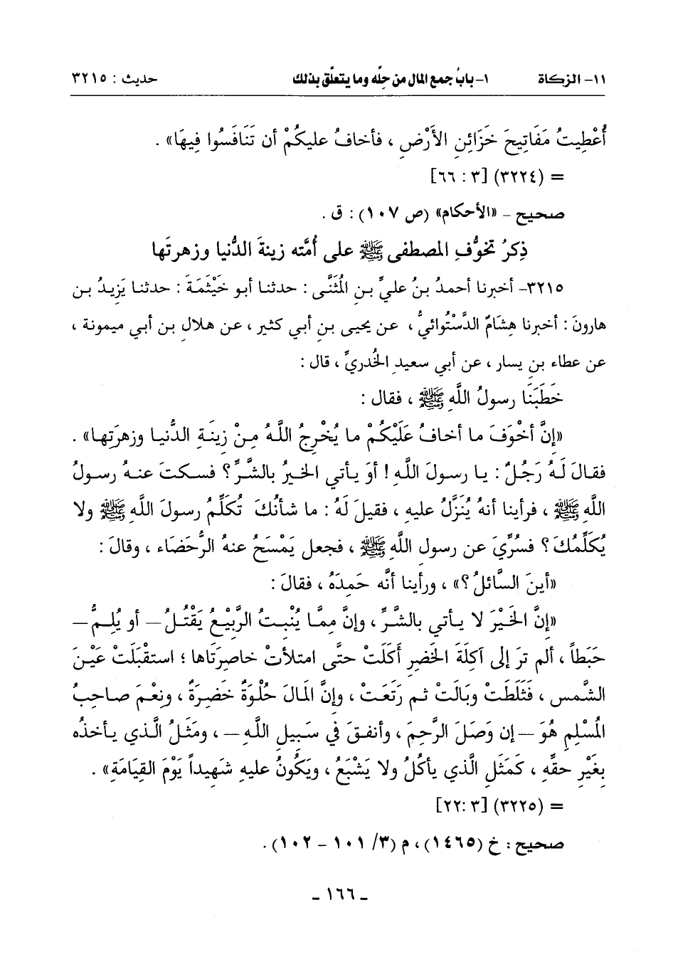 (إِنَّ الْخَيْرَ لَا يَأْتِي بِالشَّرِّ وَإِنَّ مِمَّا يُنْبِتُ الرَّبِيعُ يقتلُ ـ أَوْ يُلِمُّ ـ حَبَطًا أَلَمْ تَرَ إِلَى آكِلَةِ الْخَضِرِ أَكَلَتْ حَتَّى امْتَلَأَتْ خَاصِرَتَاهَا اسْتَقْبَلَتْ عَيْنَ الشَّمْسِ فَثَلَطَتْ وَبَالَتْ ثُمَّ رَتَعَتْ وَإِنَّ الْمَالَ حُلْوَةٌ خَضِرَةٌ وَنِعْمَ صَاحِبُ الْمُسْلِمِ هُوَ إِنْ وَصَلَ الرَّحِمَ وَأَنْفَقَ فِي سَبِيلِ اللَّهِ وَمَثَلُ الَّذِي يَأْخُذُهُ بِغَيْرِ حَقِّهُ كمثل الذي يأكل ولا يشيع ويكون عليه شهيدا يوم القيامة)
